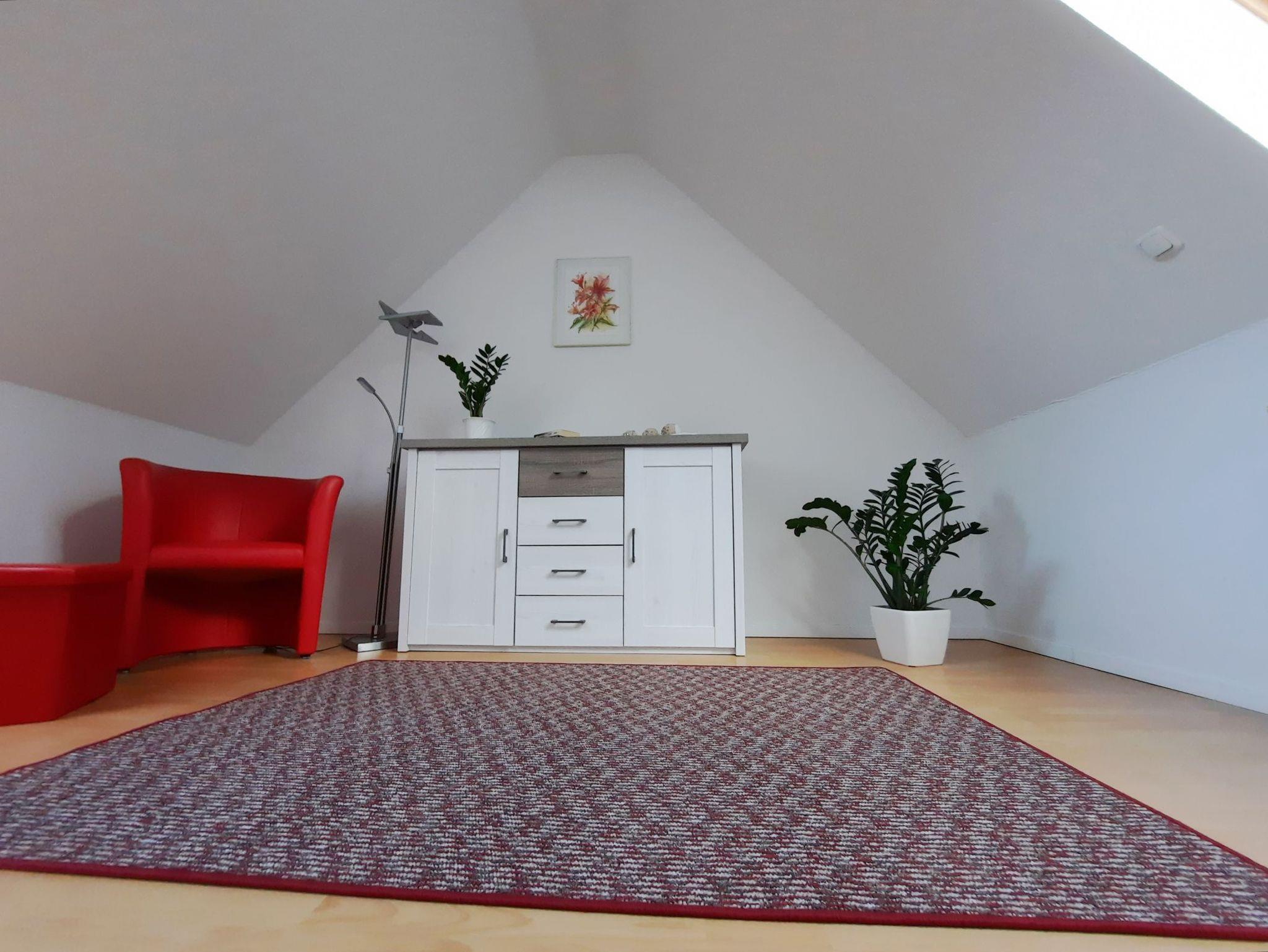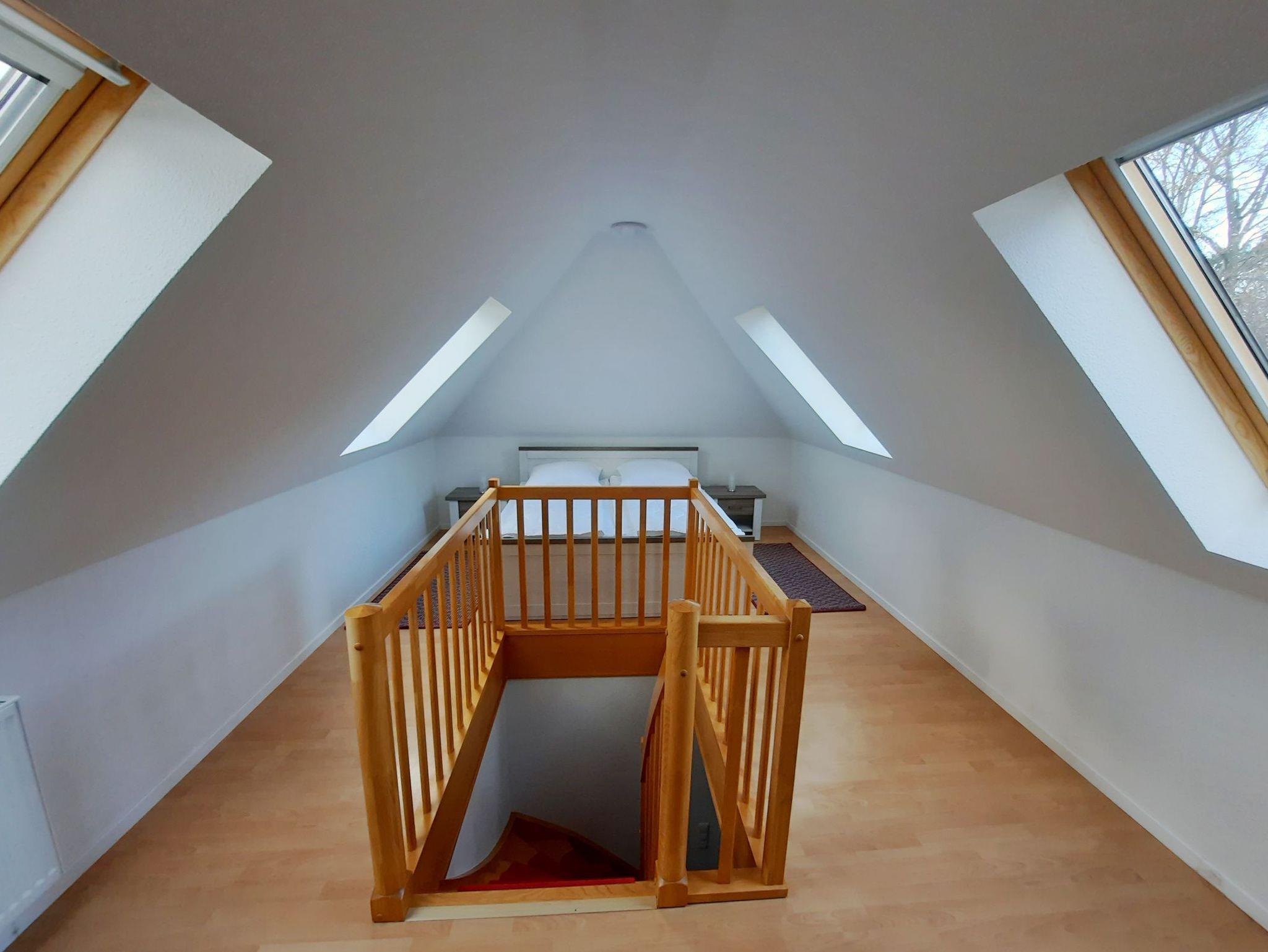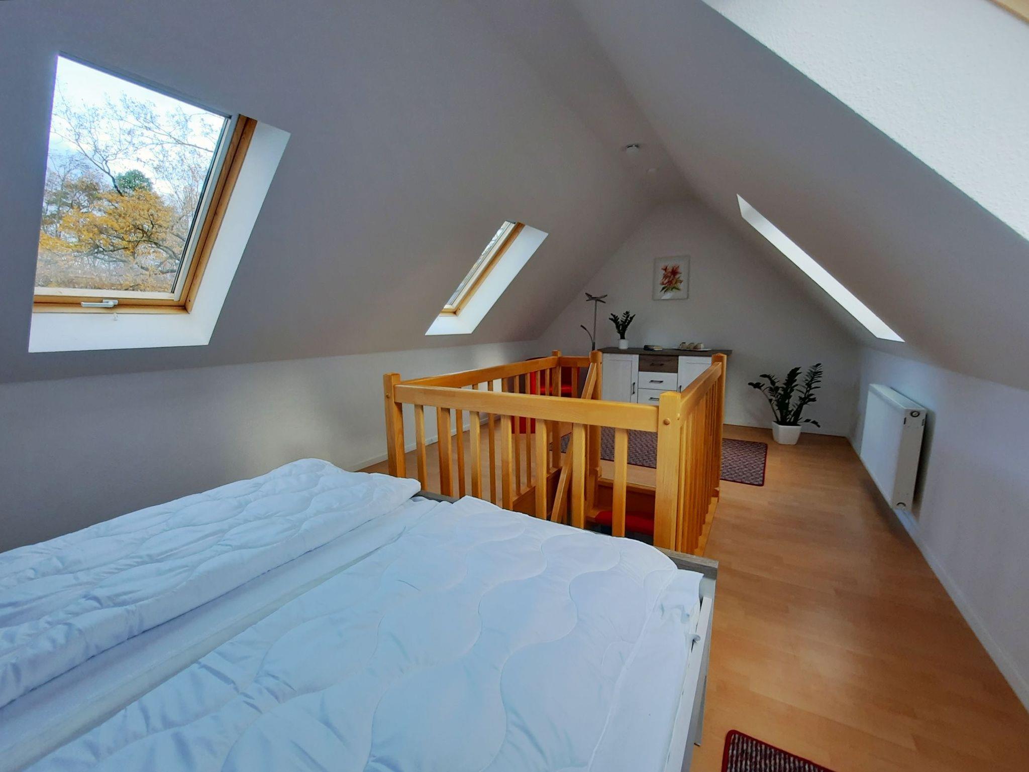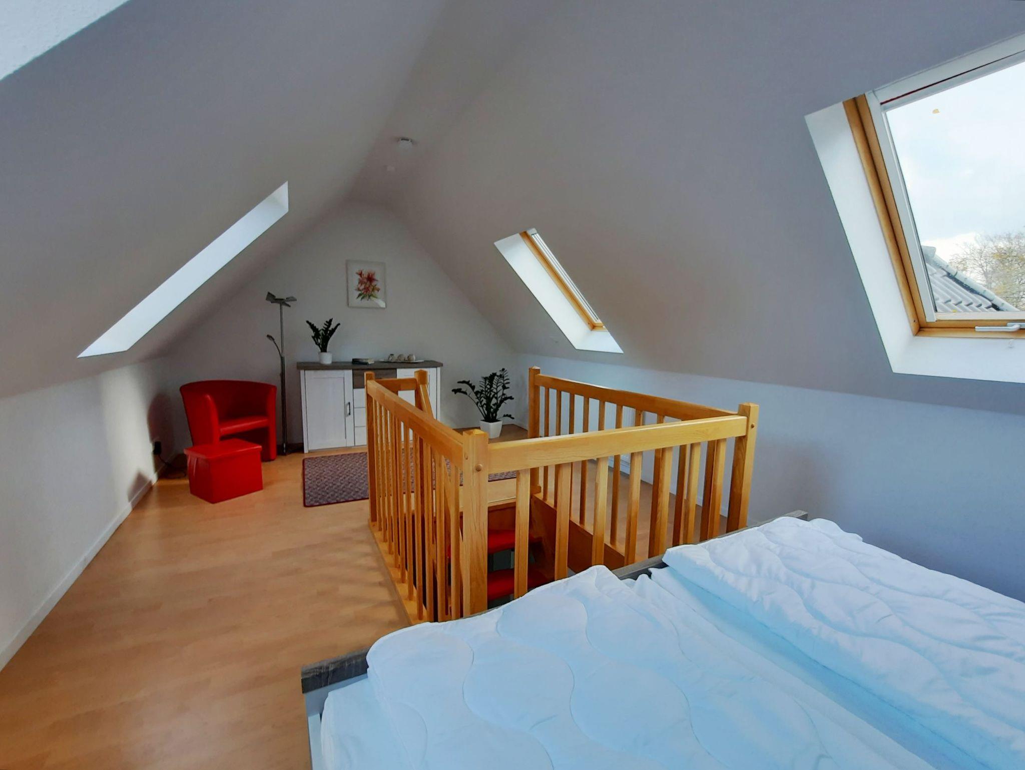 65 m² große Ferienwohnung über zwei Ebenen mit Wohnzimmer, zwei Schlafzimmern und Balkon. Fahrradschuppen und Parkplatz inklusive!