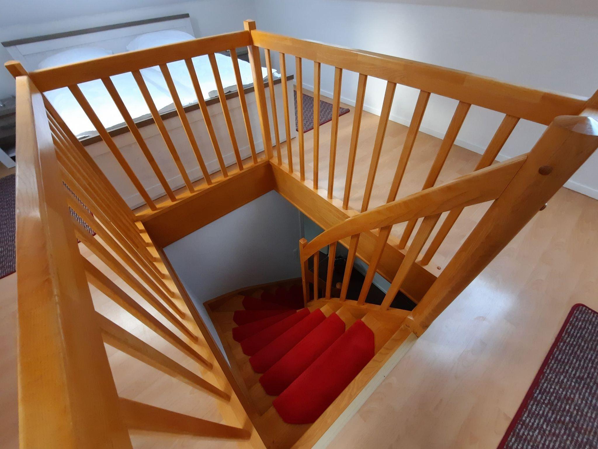 Über den Dächern vom Ostseeheilbad Graal-Müritz können Sie in dieser geräumigen 3-Zimmer-Ferienwohnung Ihren Urlaub entspannt verbringen. Die Wohnung erstreckt sich über insgesamt 65 qm und ist über 2 Ebenen verteilt. Vom Flur aus gelangen Sie in das gemütliche Wohnzimmer mit offener Küche. In der Küche befinden sich ein Geschirrspüler, eine Mikrowelle, ein Ceranfeld mit 4 Kochplatten, eine Kaffeemaschine und ein Wasserkocher. Das untere Schlafzimmer ist mit 2 Einzelbetten (jeweils 90x200 cm) und einem Kleiderschrank ausgestattet. Über eine Treppe gelangen Sie zu dem weiteren Schlafzimmer, in welchem sich ein Doppelbett (180 x 200 cm), eine Kommode und ein Sessel befinden (offene Galerie). Alle Wohn- und Schlafräume sind mit Rollos zum Abdunkeln ausgestattet. Im Bad befinden sich eine Dusche und ein WC. Vom Wohnzimmer aus können Sie auf den sonnigen, großen Balkon treten. Dieser ist für gemütilche Sonnenstunden mit Balkonmöbeln für Sie augestattet. Zu Ihrer Ferienwohnung gehören außerdem ein abschließbarer Fahrradschuppen und ein PKW-Parkplatz direkt vor dem Haus.