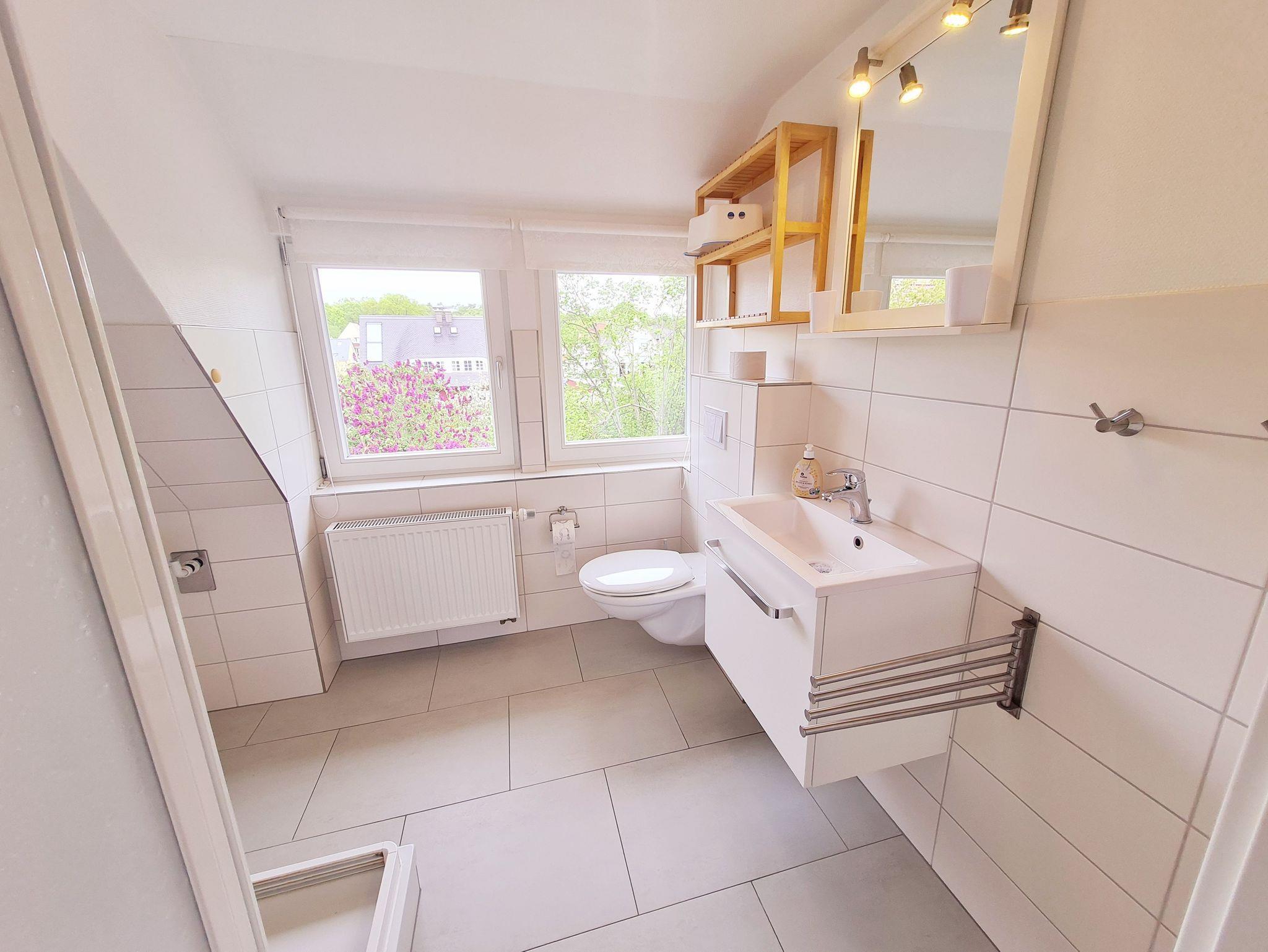 • Badezimmer: mit Fenster, Dusche, WC, Waschbecken mit Unterschrank, Handtuchhalter, Spiegel, Regal, Tritt
