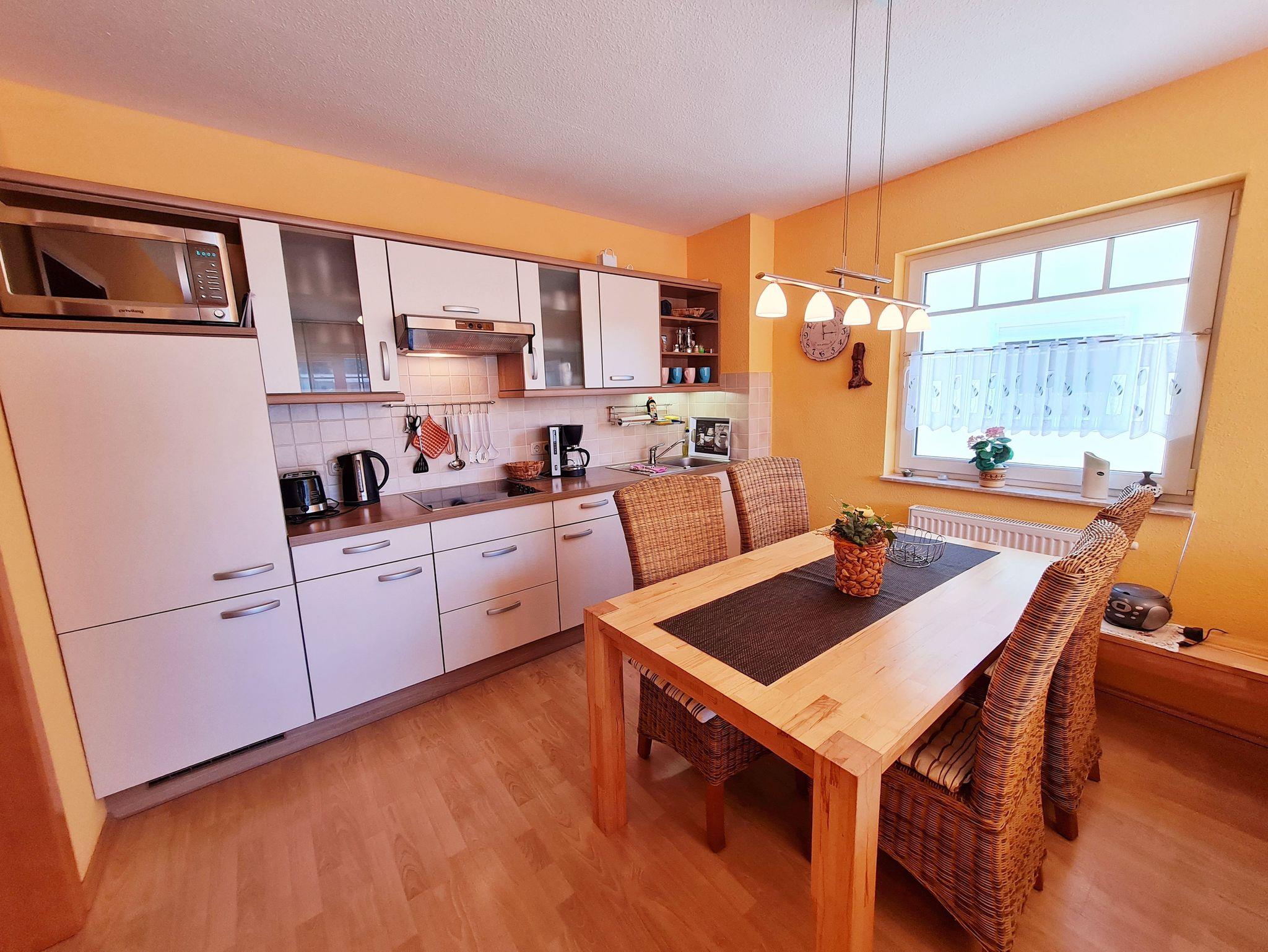 • Küche und Essbereich für 4 Personen offen zum Wohnzimmer, komplett eingerichtete Einbauküche mit Ceranfeld, Toaster, Kaffeemaschine, Wasserkocher, Kühlschrank mit Eisfach, Mikrowelle mit Heißluft und Grill, Geschirrspüler