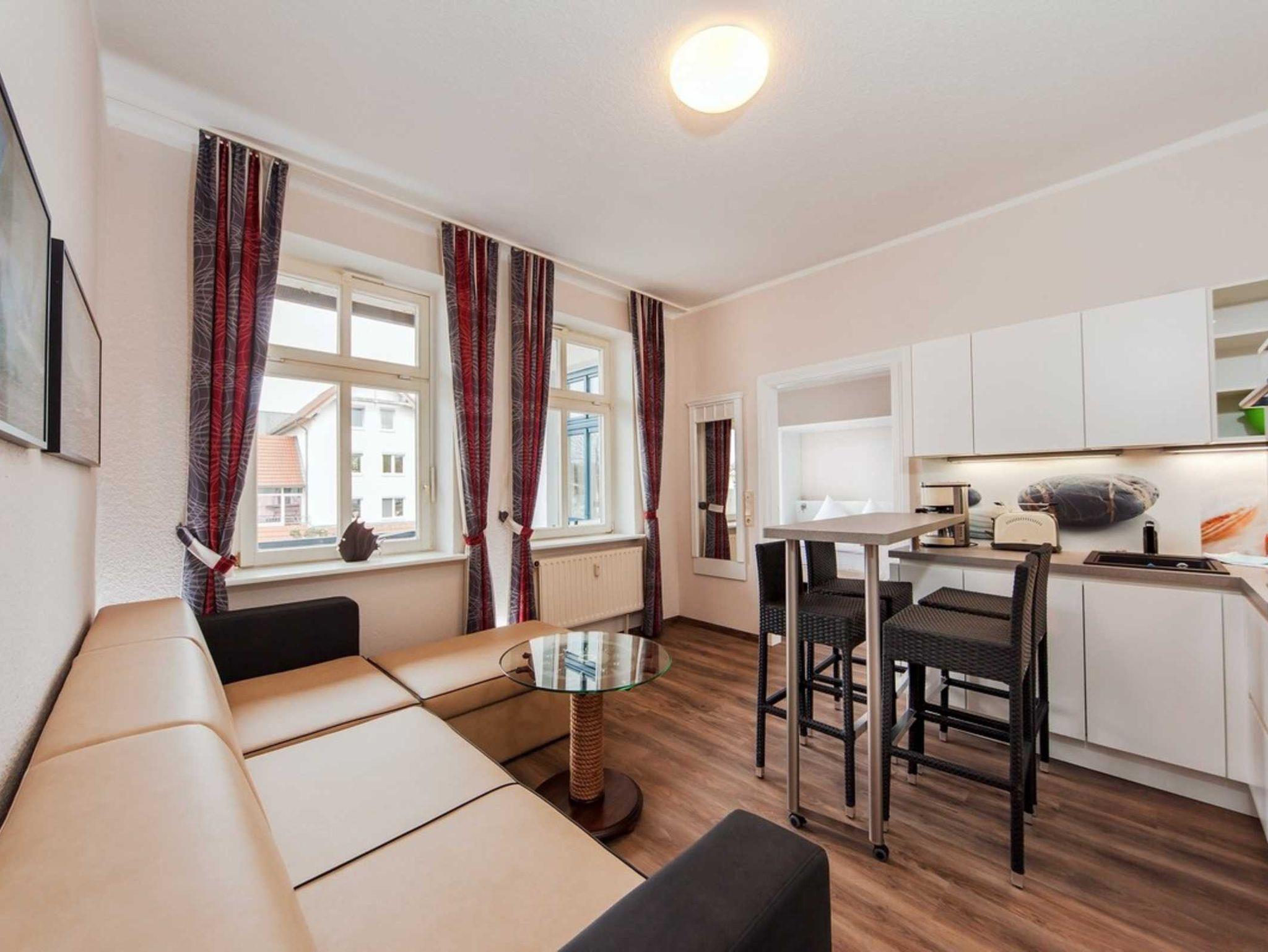 Dieses Appartement verfügt über ein Schlafzimmer mit Doppelbett und einen kombinierten Wohn- und Küchenbereich mit Schlafcouch, die maximal 2 zusätzlichen Personen erholsamen Schlaf bietet. Vom Schlafzimmer gelangen Sie auf den überdachten Balkon, der Ihnen einen Ausblick auf die Kurstraße gibt.