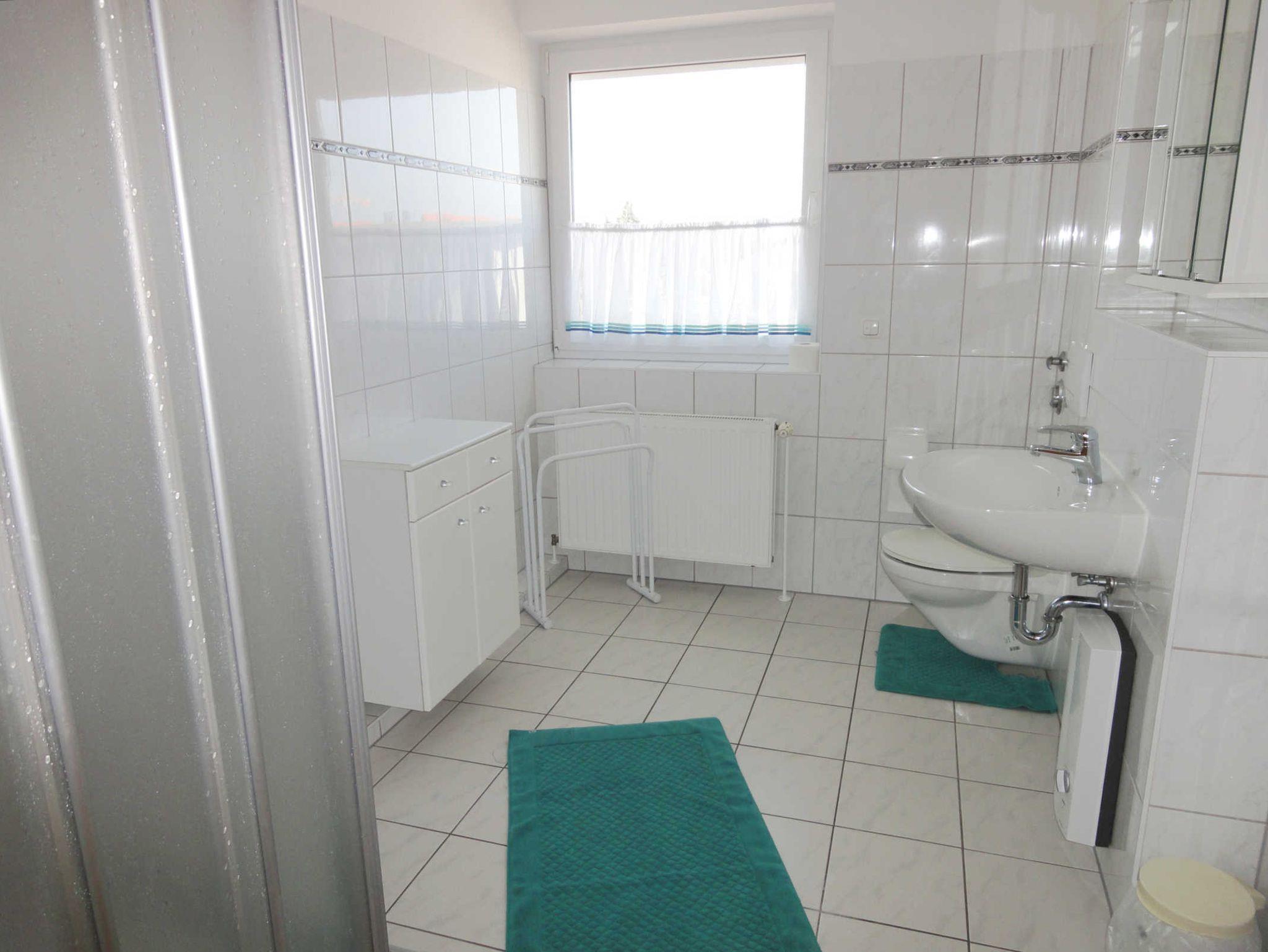Das geflieste Bad ist mit einer Dusche, einem Waschtisch und einem WC ausgestattet.