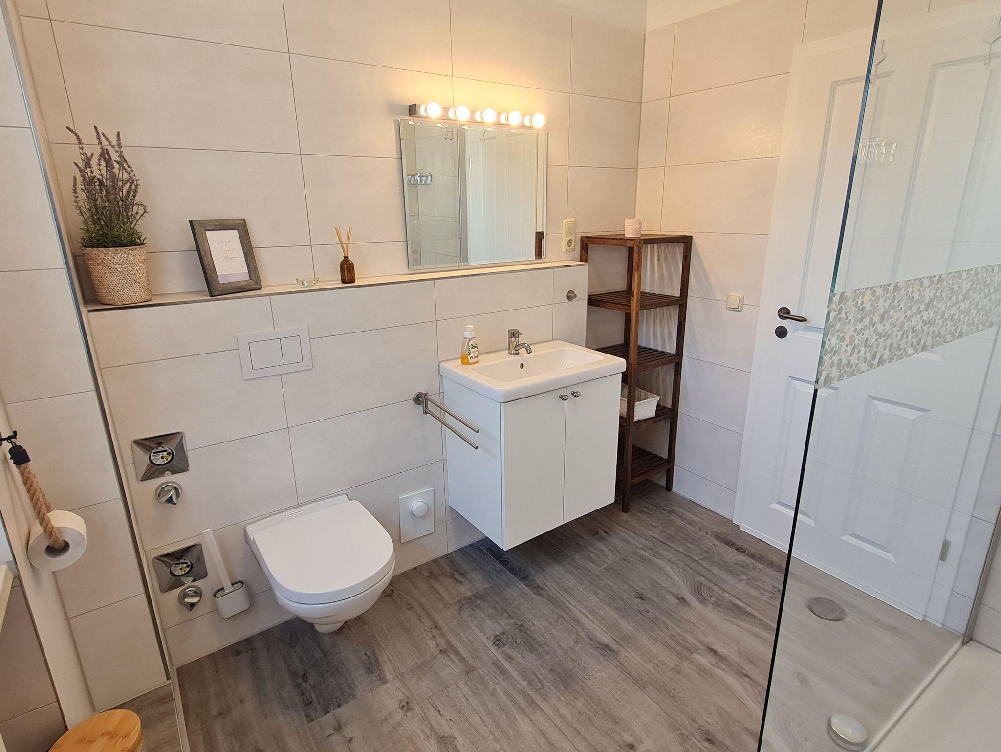 • Bad: Tageslichtbad mit geräumiger Dusche, Waschtisch mit Unterschrank, Toilette, Spiegel, Handtuchhalter, Regal