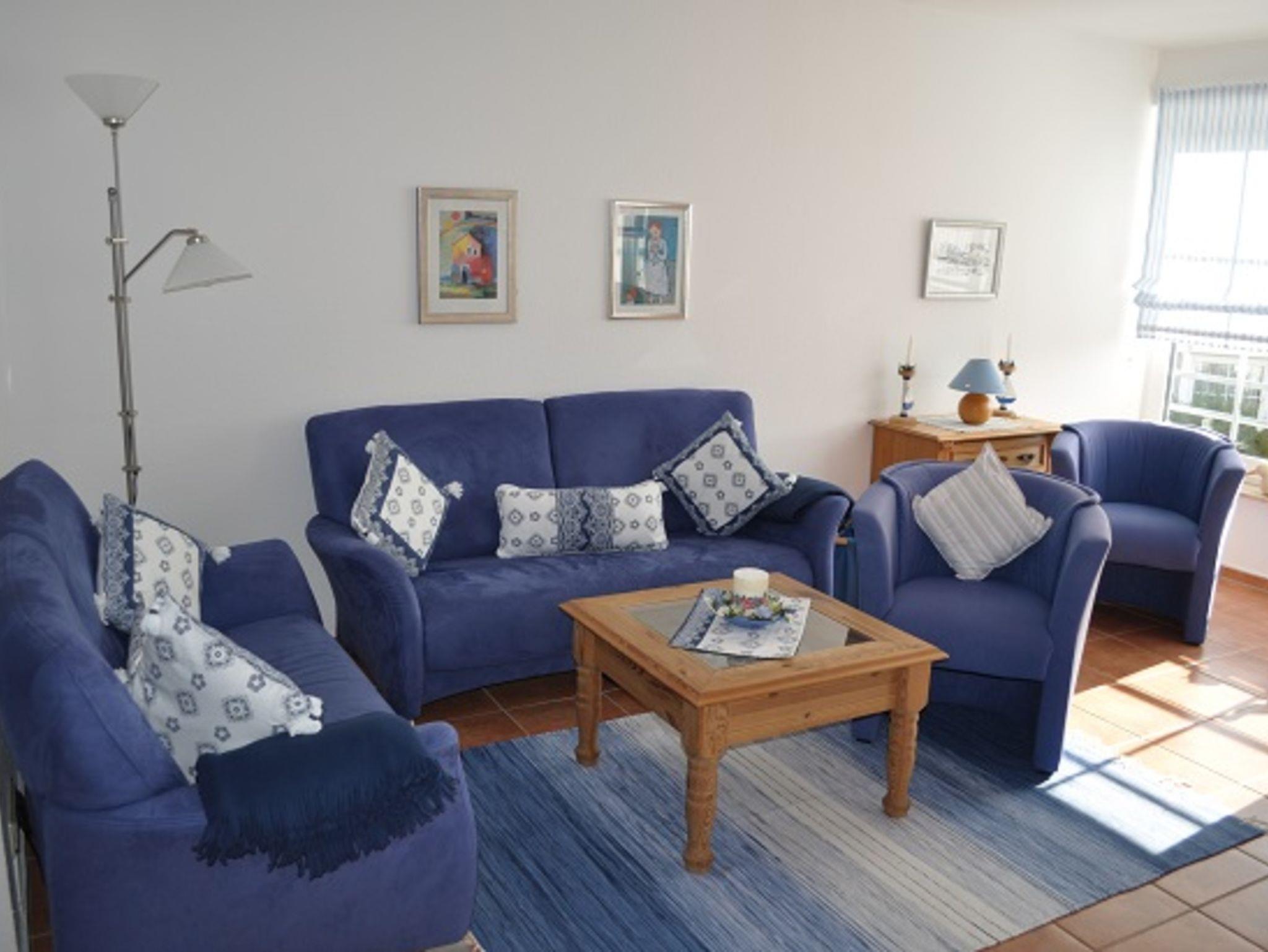 Farblich sind alle Möbelstücke und die Accessoires in der gesamten Wohnung in harmonischen Blautönen und natürlichen braunen Kiefertönen so aufeinander abgestimmt, dass diese Farbstimmung den besonderen Charme der Wohnungseinrichtung ausmacht. Der in einem warmen, hellen, rotbraunen Farbton geflieste Fußboden ist mit Teppichen und Läufern, farblich aufeinander abgestimmt und trägt so zum gemütlichen Ambiente der Wohnung bei.