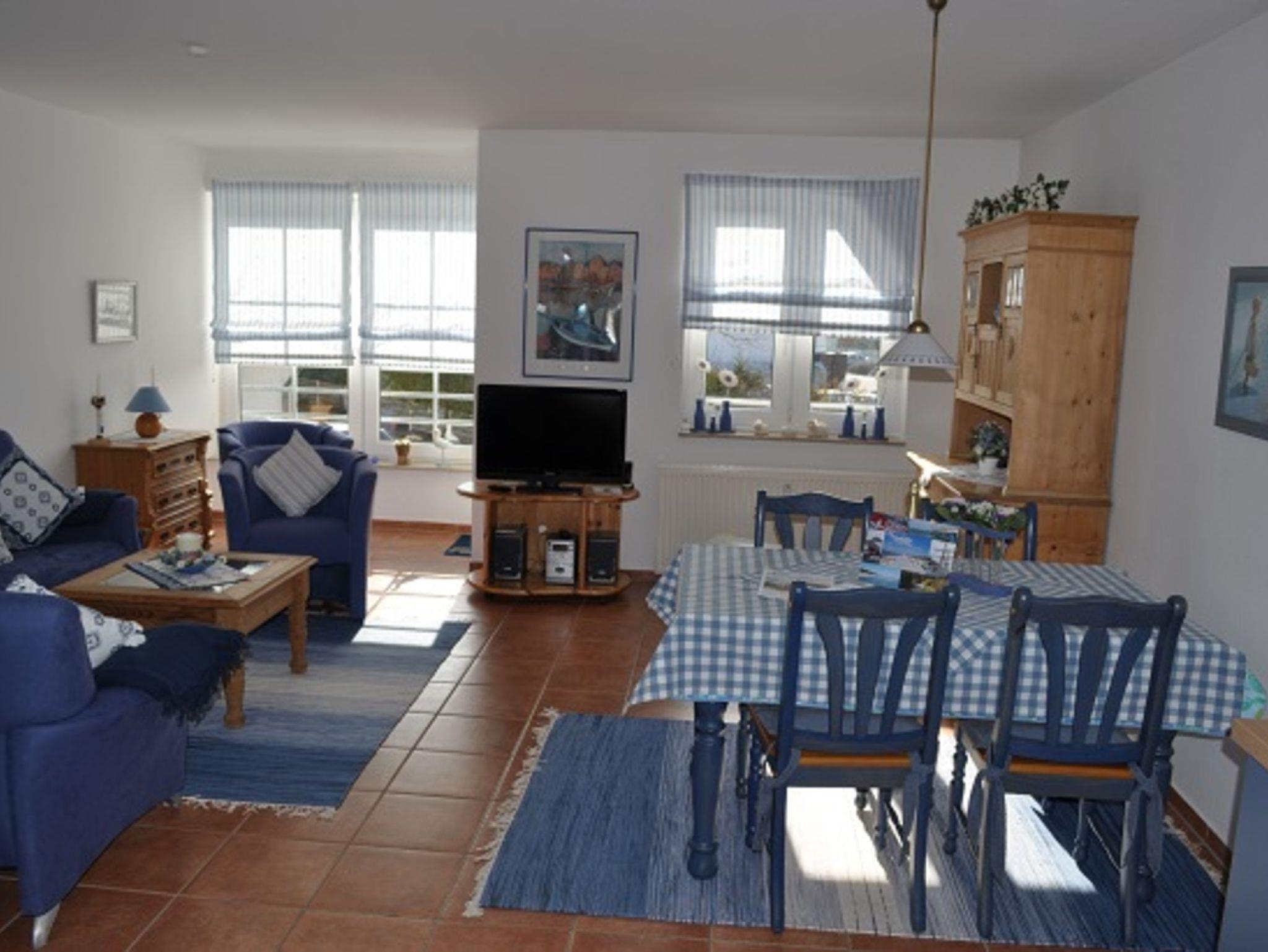 Der fast 30 Quadratmeter große Wohnbereich besteht aus einer bequemen Sitzecke mit Rundsofa, einer geschmackvollen Essecke und einer modernen, funktionalen Einbauküche mit Backofen, Ceran-Kochfeld, Kühlschrank und Geschirrspüler. Zur technischen Grundausstattung gehören außerdem alle notwendigen elektrischen Haushaltsgeräte wie Kaffeemaschine, Toaster, Eierkocher, Wasserkocher, Handmixer, Staubsauger. TV und eine HiFi Stereoanlage bieten zeitgemäße Unterhaltung.