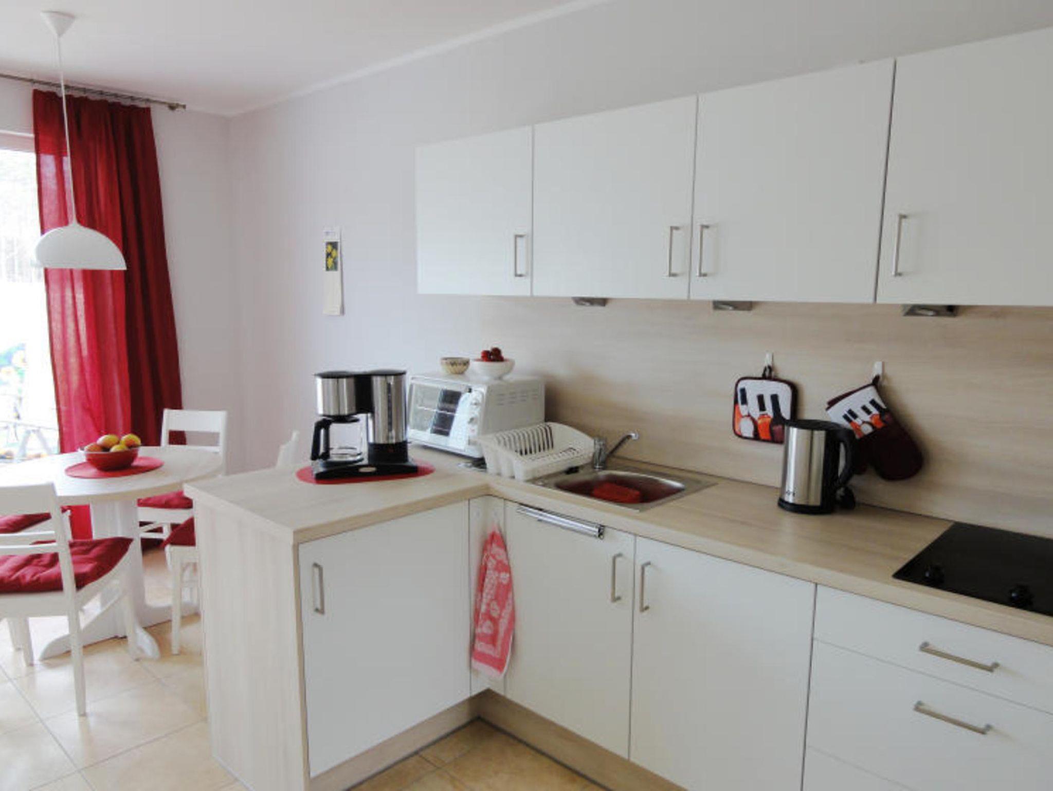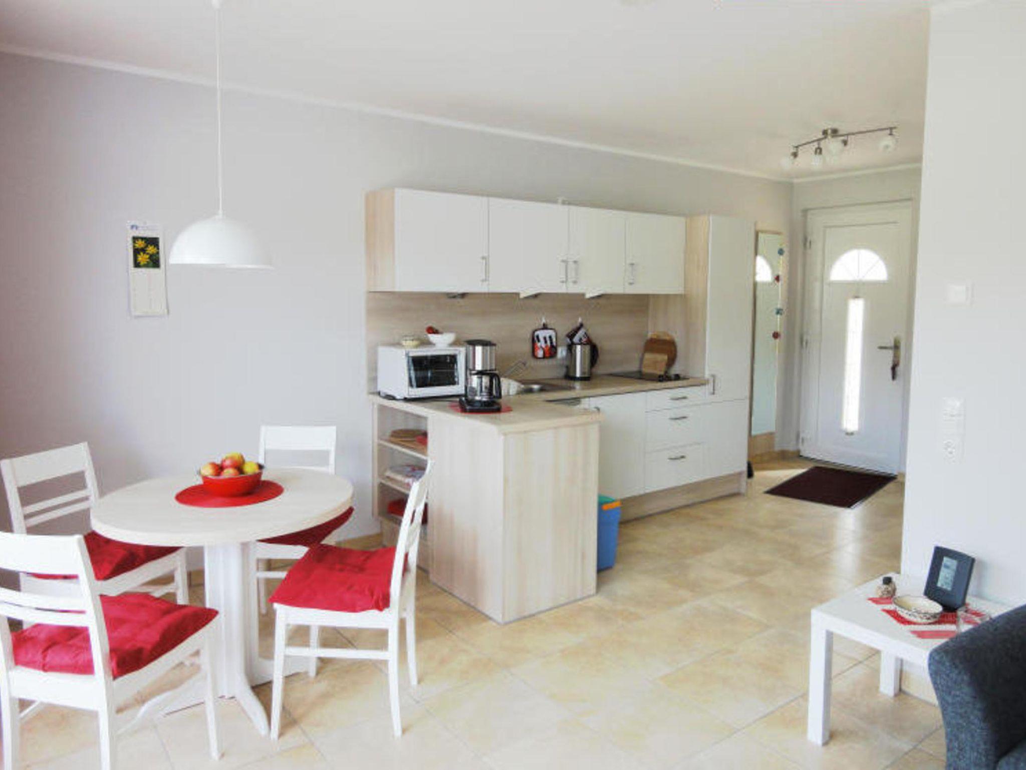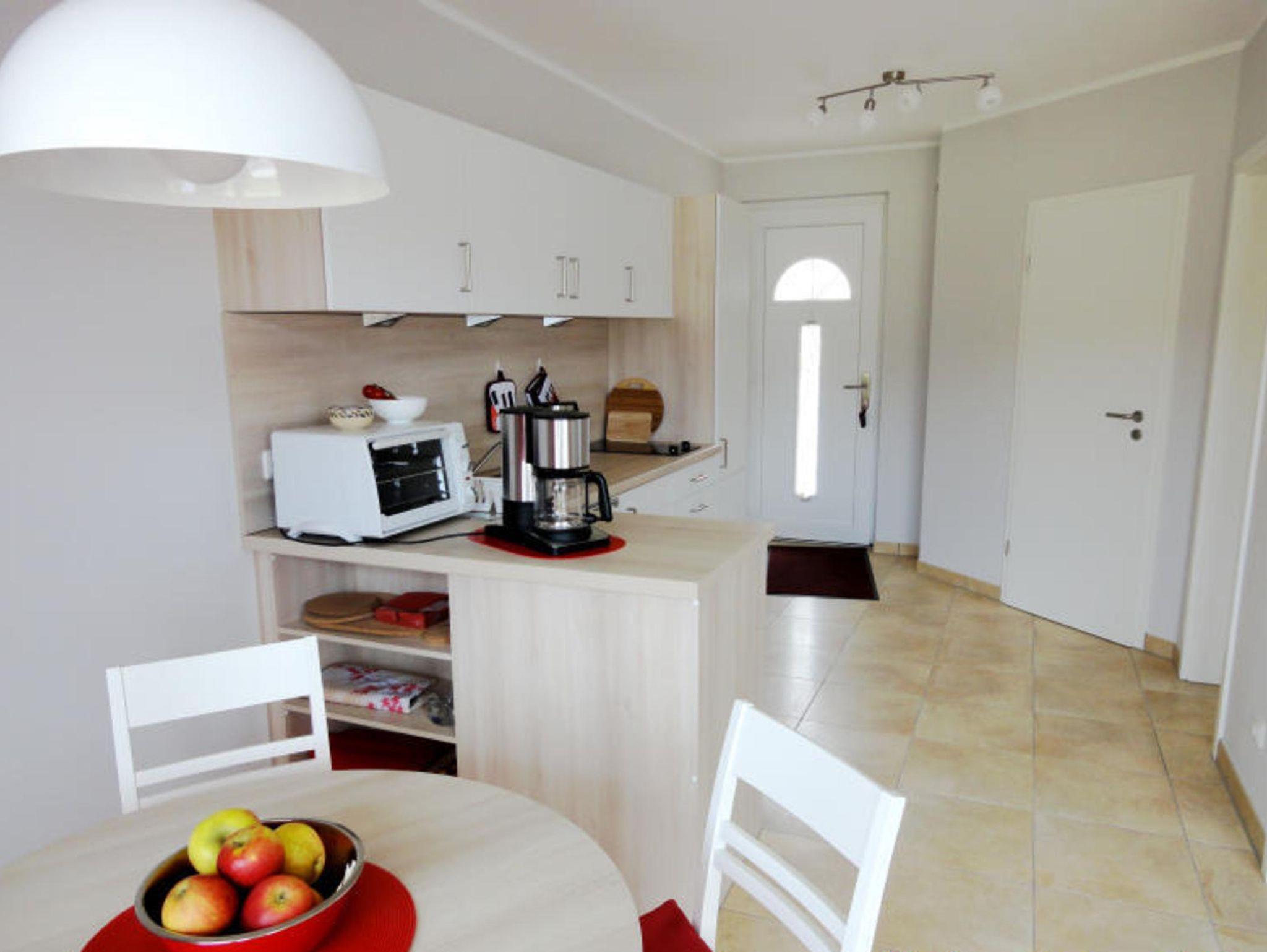 Die in das Wohnzimmer integrierte Küche ist u.a. mit einem Kühlschrank, einem Cerankochfeld, einem Minibackofen, einem Wasserkocher und einer Kaffeemaschine sowie einem Esstisch mit 4 Stühlen ausgestattet.