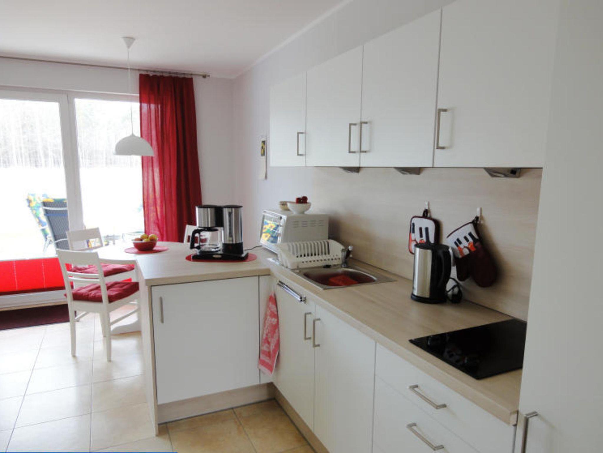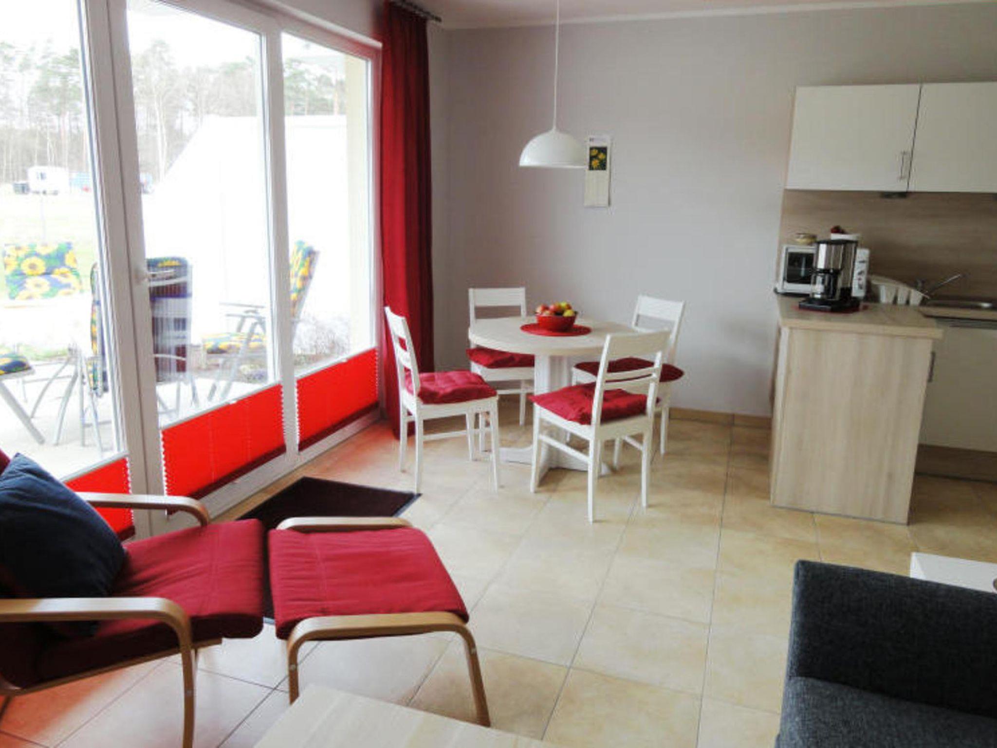 2 Zimmer Ferienwohnung im Ferienwohnpark Küstenwald mit Terrasse, Schlafzimmer, Küchenzeile, Bad mit Dusche und WC, Wohnzimmer mit Couch und Flachbild-TV, PKW-Stellplatz