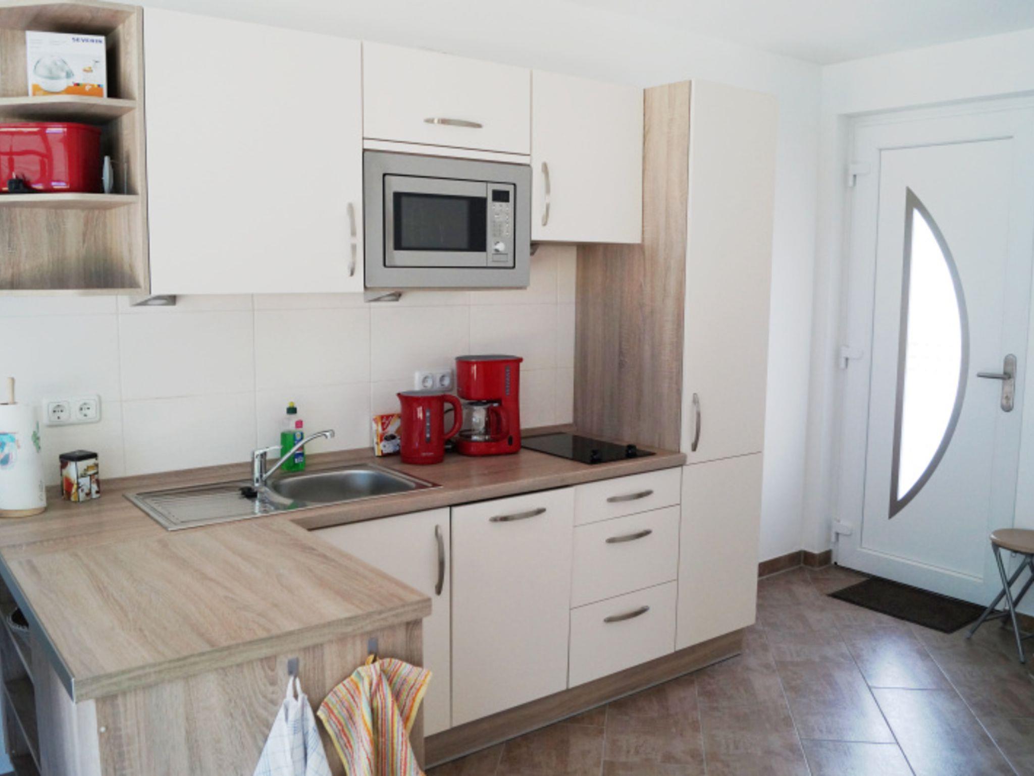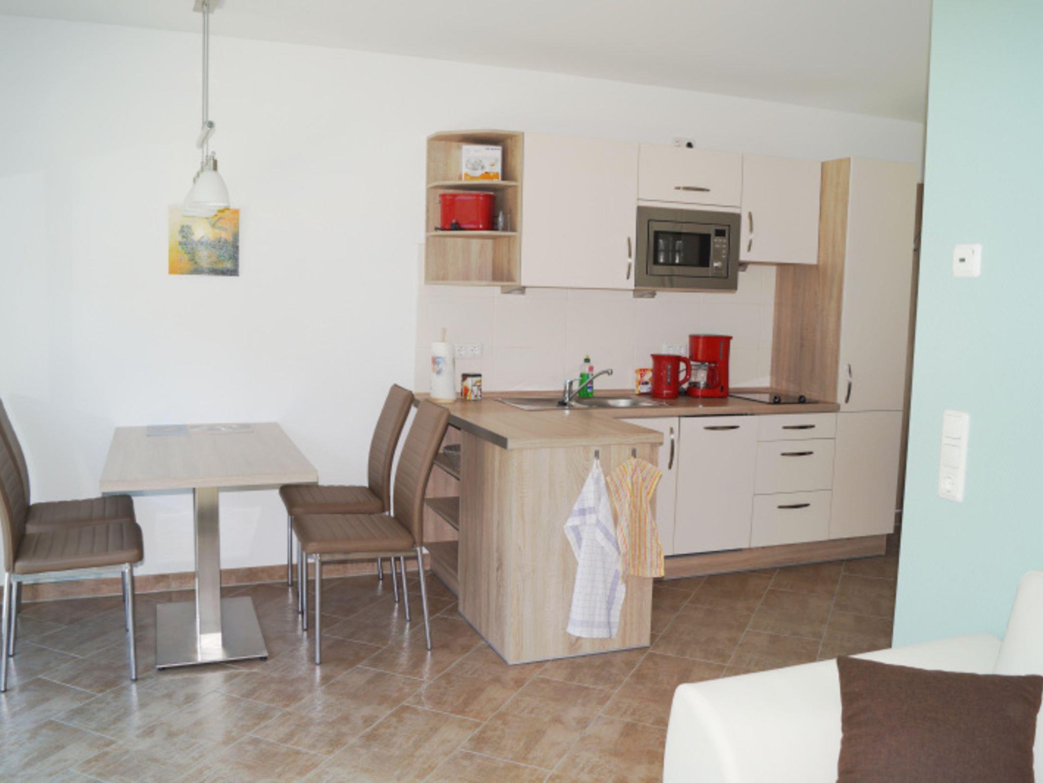 Die in das Wohnzimmer integrierte offene Küche ist u.a. mit einem Kühlschrank mit Gefrierfach, einem Ceranfeld (2 Kochplatten), einer Geschirrspülmaschine, einer Mikrowelle, einem Wasserkocher und einer Kaffeemaschine sowie einem Esstisch mit 4 Stühlen ausgestattet.