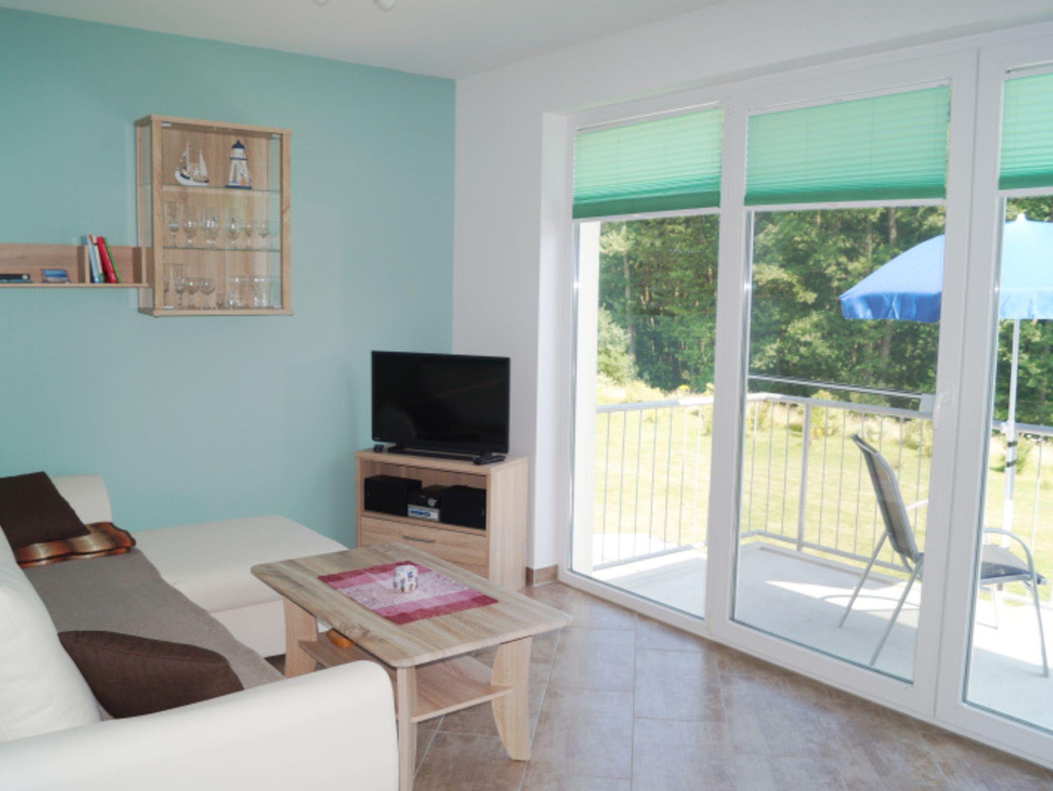 2 Zimmer Ferienwohnung im Ferienwohnpark Küstenwald mit Balkon, Schlafzimmer, Küchenzeile, Bad mit Dusche und WC, Wohnzimmer mit Couch und Flachbild-TV, PKW-Stellplatz