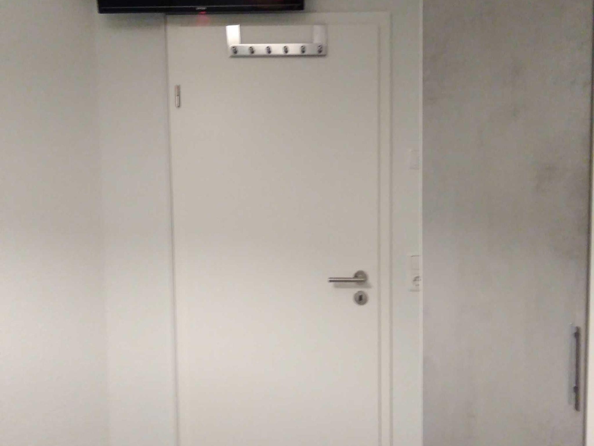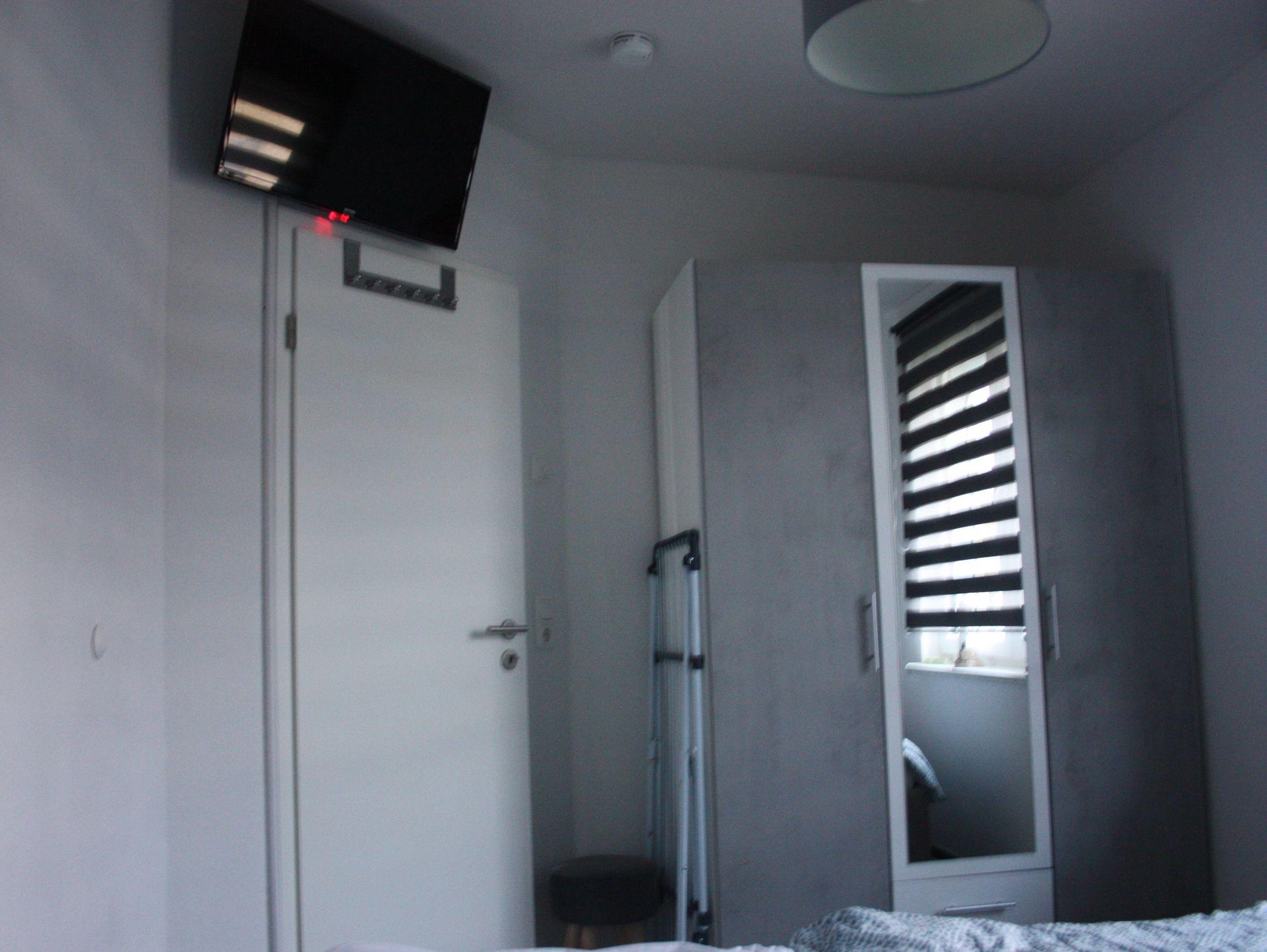 ein Kleiderschrank, eine Außenjalousie und ein zweiter Fernseher.