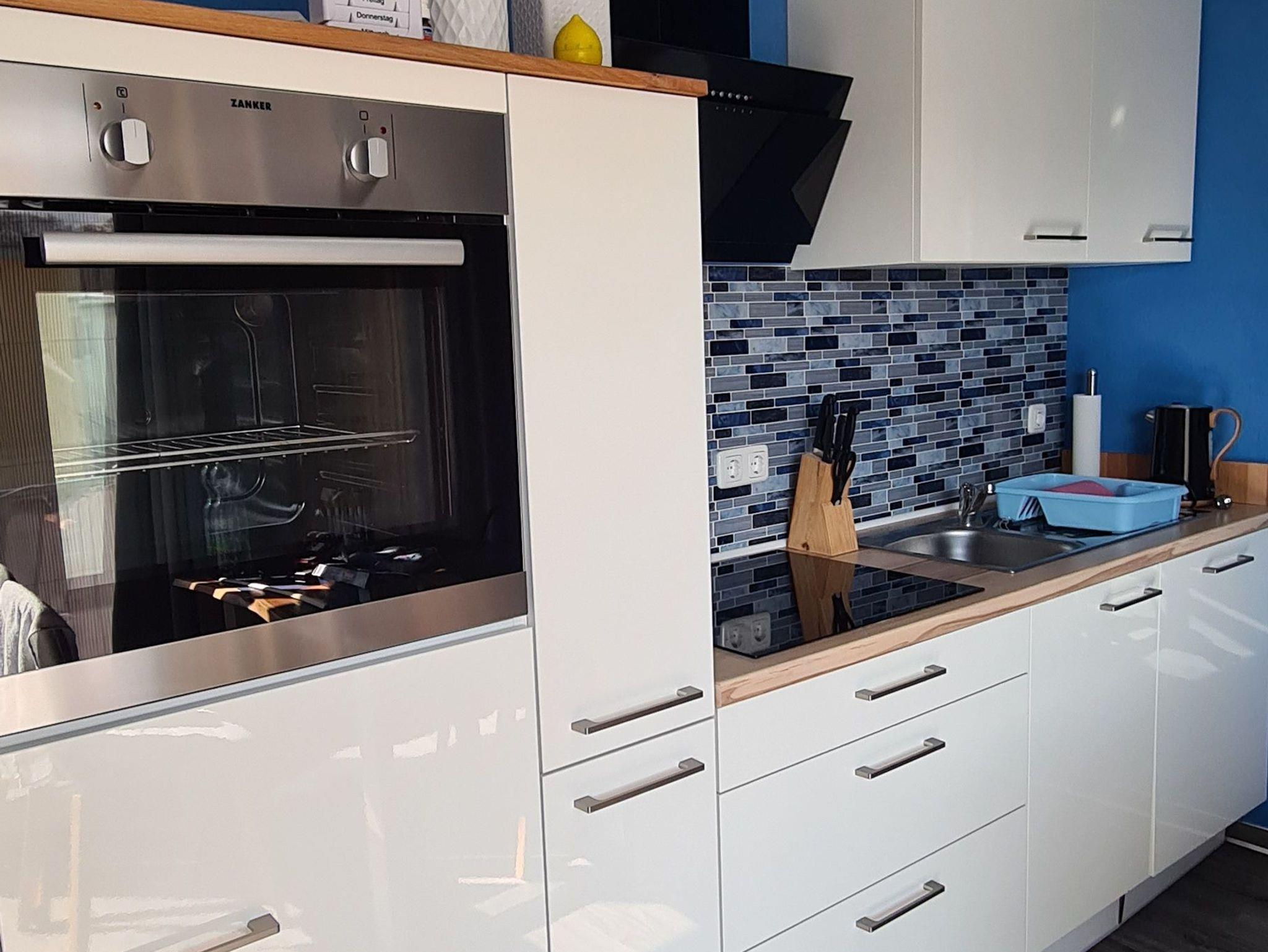 Die Küchenzeile verfügt über einen Geschirrspüler, Backofen, Ceranfeld, Wasserkocher, Kaffeemaschine, Toaster, Kühlschrank mit Gefrierfach und sowie eine umfangreiche Küchenausstattung.