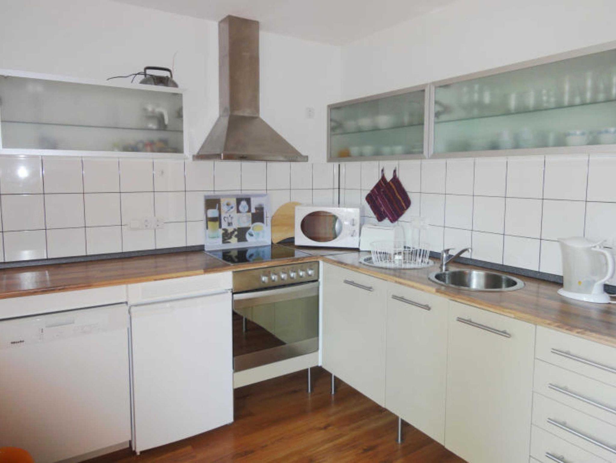 Die in das Wohnzimmer integrierte offene Küche mit Essecke verfügt unter anderem über einen Herd (4 Platten) mit einer Backröhre, einen Kühlschrank, eine Mikrowelle, einen Geschirrspüler, eine Kaffeemaschine und einen Wasserkocher.