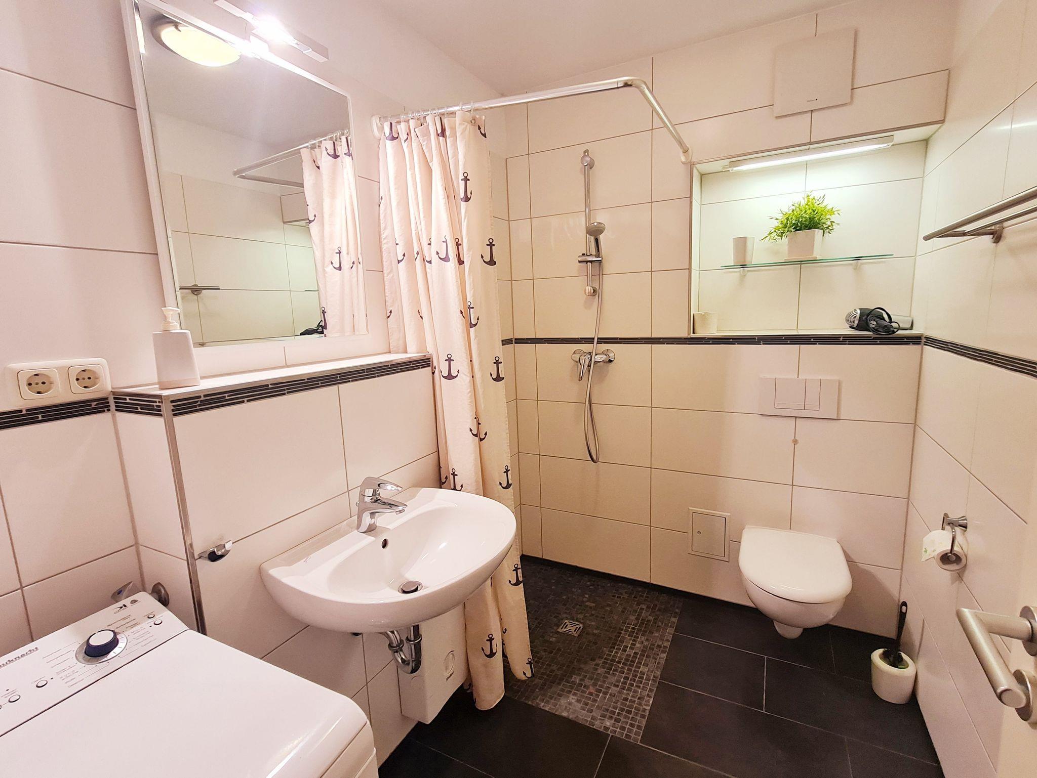 • Bad: mit ebenerdiger Dusche, WC, Waschbecken, Spiegel, Handtuchhalter und Waschmaschine