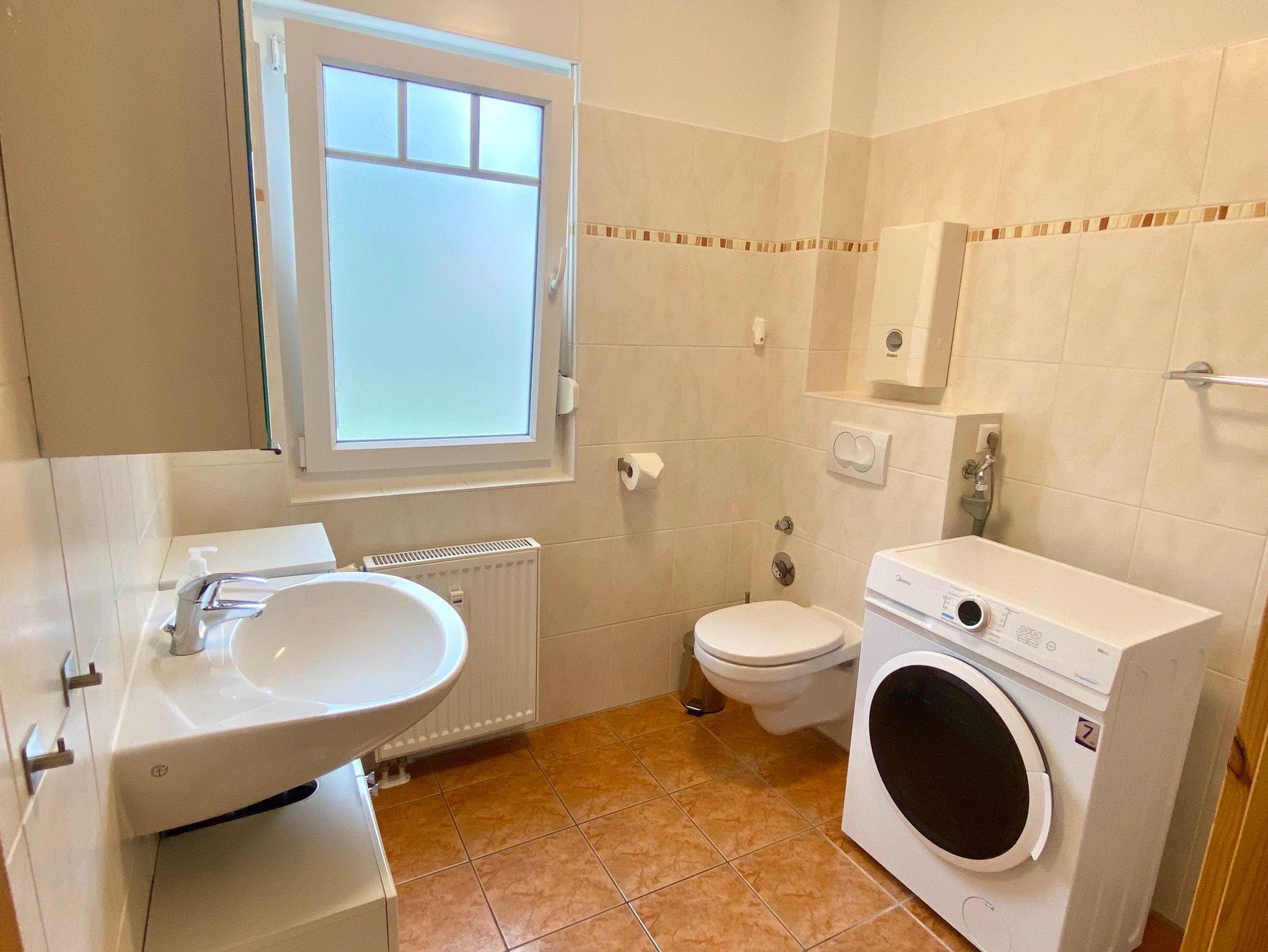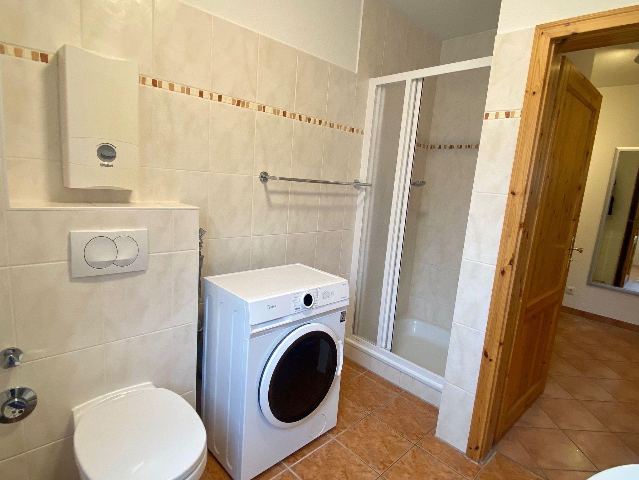 • Bad: mit Fenster, Dusche, Waschbecken, Toilette, Spiegelschrank, Handtuchhalter, Schrank, Waschmaschine, Fön, Tritthocker für Kinder