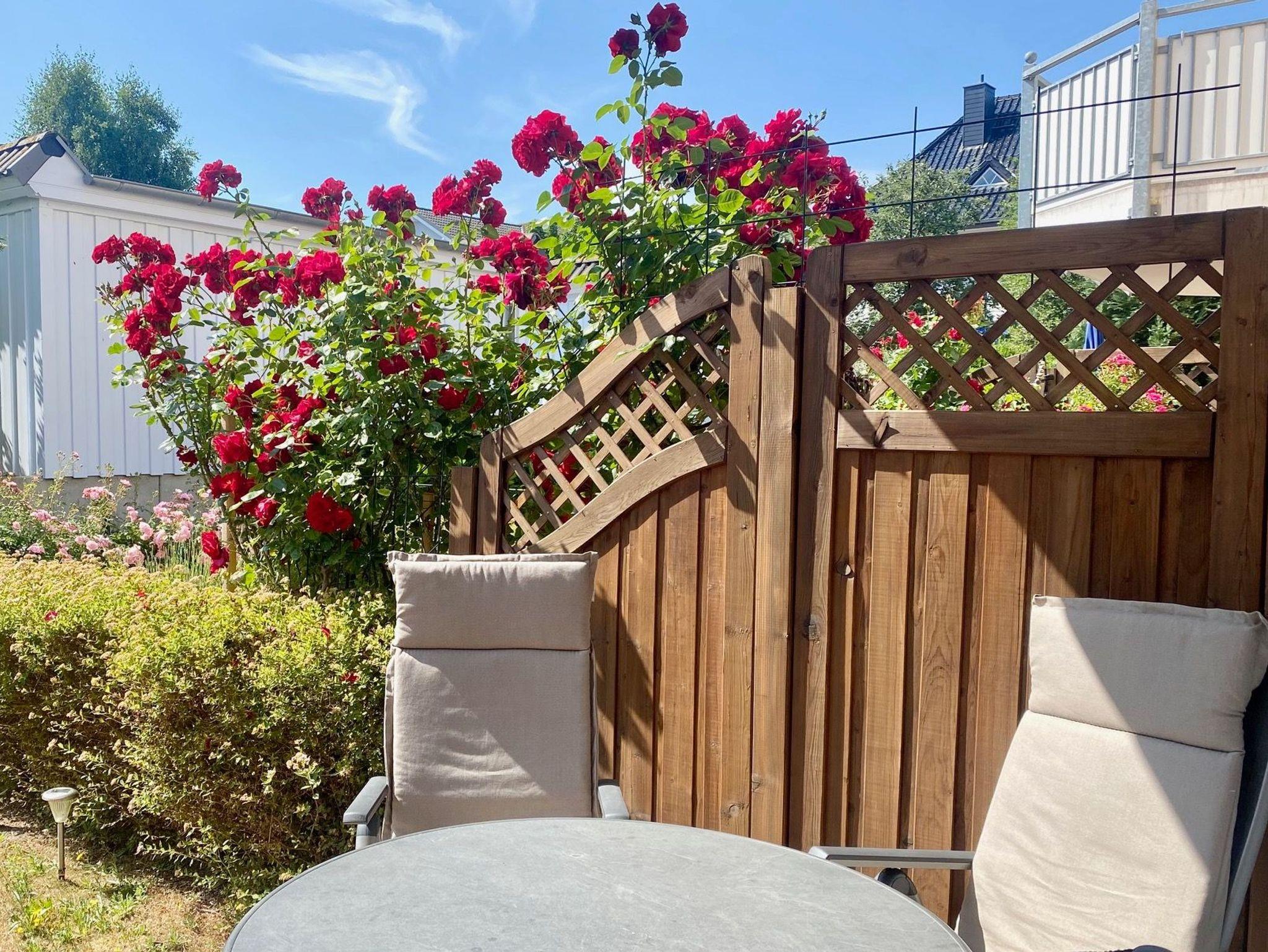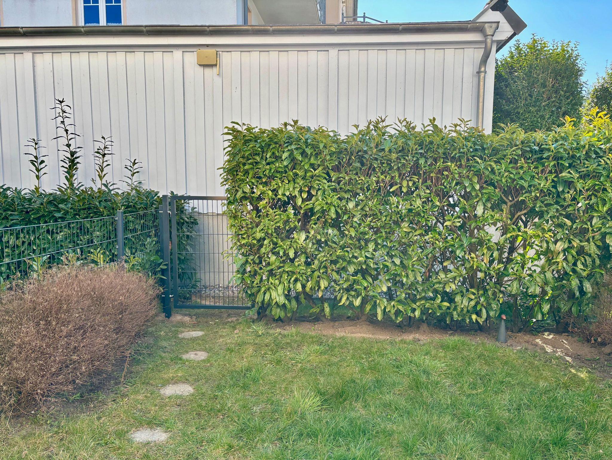 • Terrasse: Südausrichtung mit abgeschlossenem Gartenstück, großer Tisch, 4 Stühle mit Sitzauflagen, Sonnenschirm