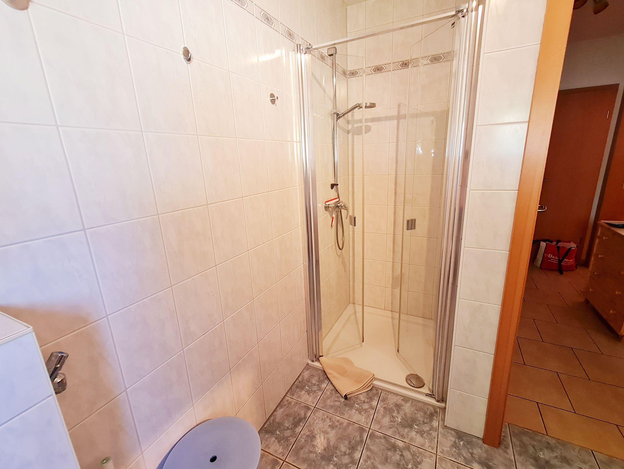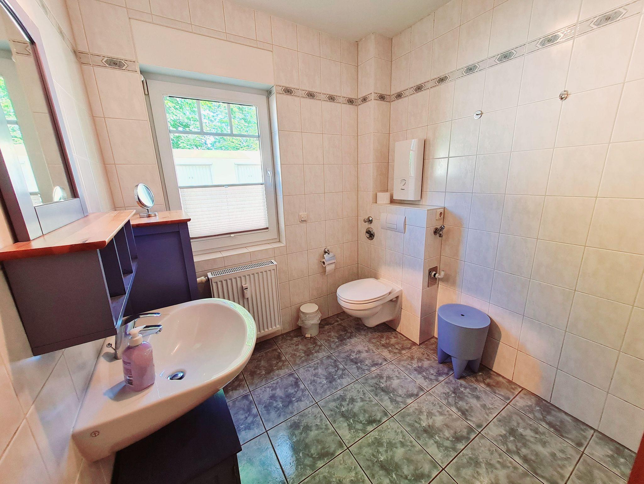 • Bad: mit Fenster, Dusche (ebenerdig), Waschbecken, Toilette, Spiegelschrank, Unterschrank Waschbecken, Wäschetonne als Sitz