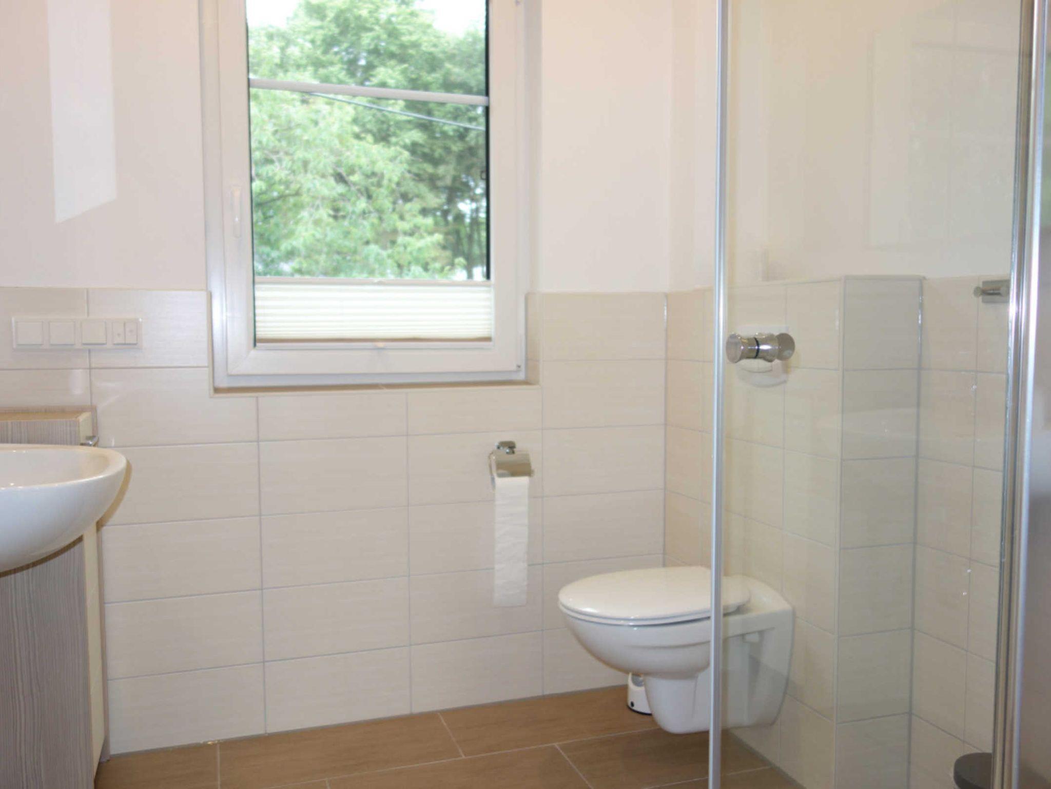 In dem Bad mit Fenster finden Sie eine Dusche, ein WC und ein Waschbecken.
