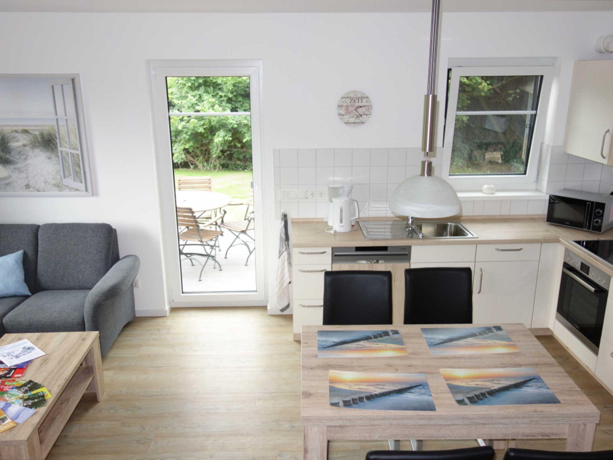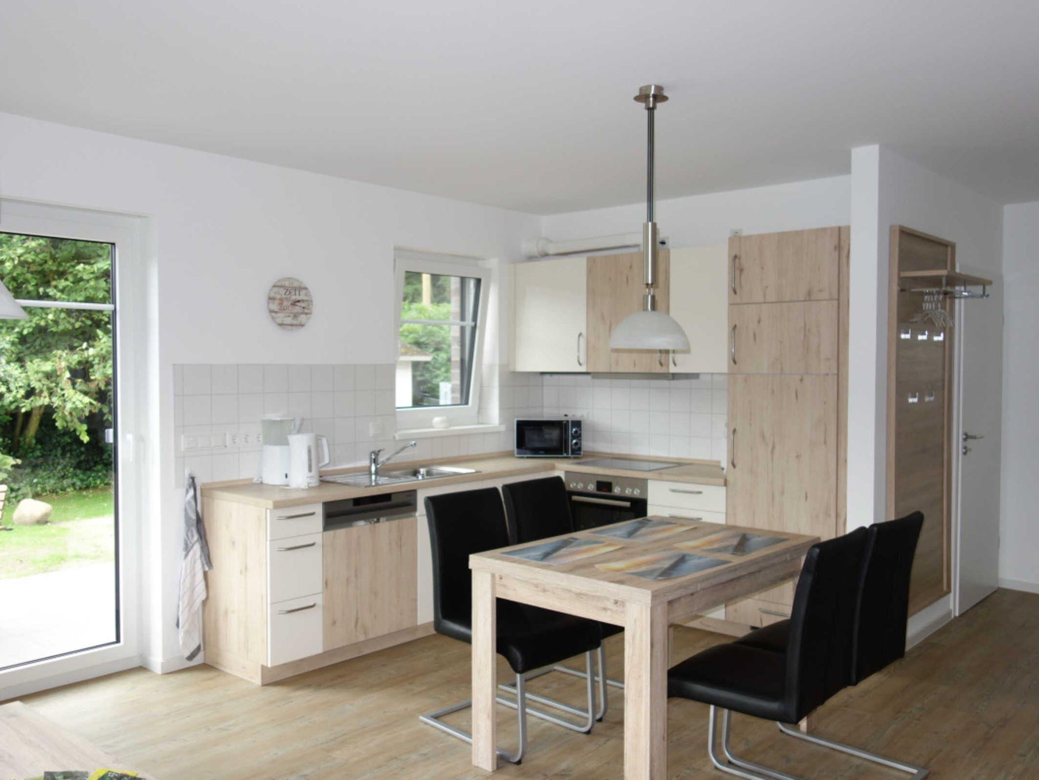 Die große Küchenzeile ist komplett ausgestattet u.a. mit einem Backofen, einem Cerankochfeld mit 4 Kochflächen, einem Kühlschrank, einem kleinem Gefrierfach, einer Kaffeemaschine und einem Wasserkocher. An dem Esstisch mit 4 Stühlen können Sie die Mahlzeiten einnehmen oder Gesellschaftsspiele spielen.