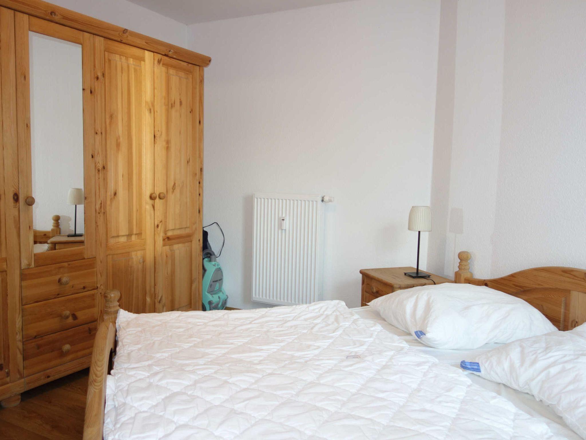 Im Schlafzimmer stehen ein großes Doppelbett (2 Matratzen mit 90 x 200 cm) und ein Kleiderschrank.