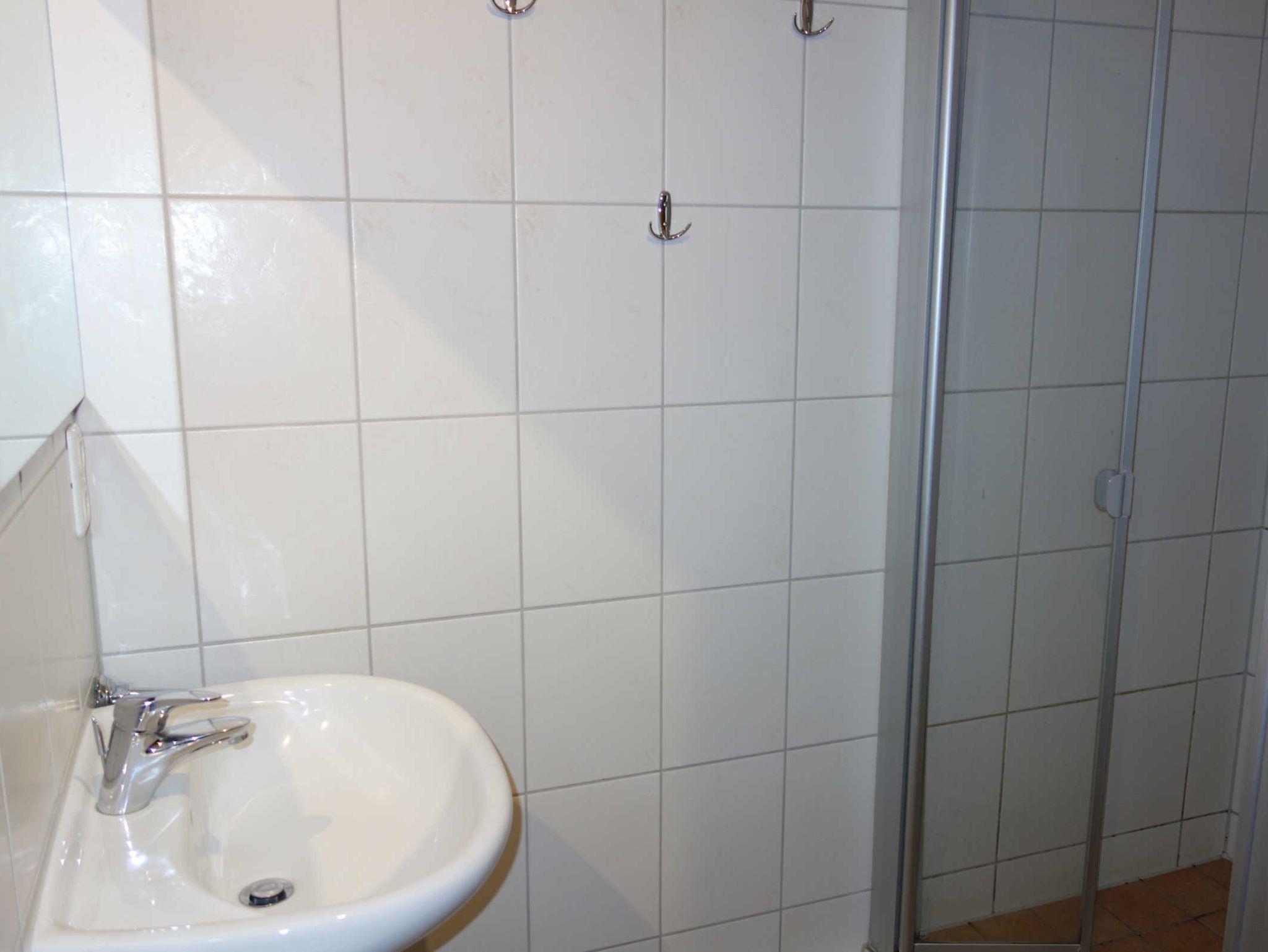 Im Bad sind eine Dusche, ein Waschtisch und ein WC.