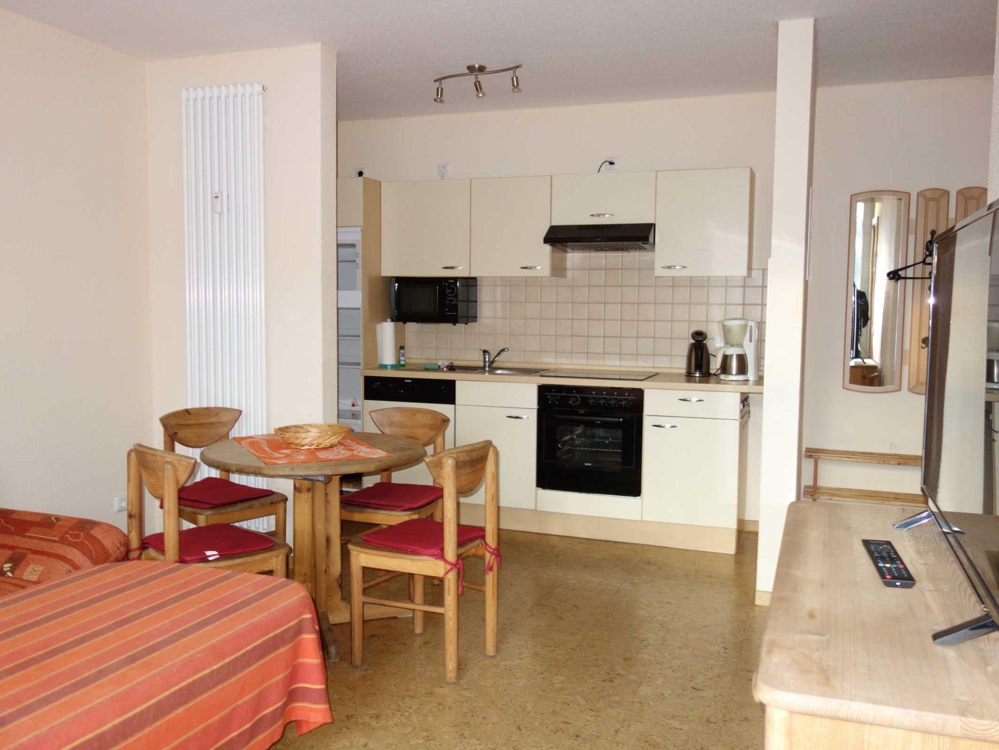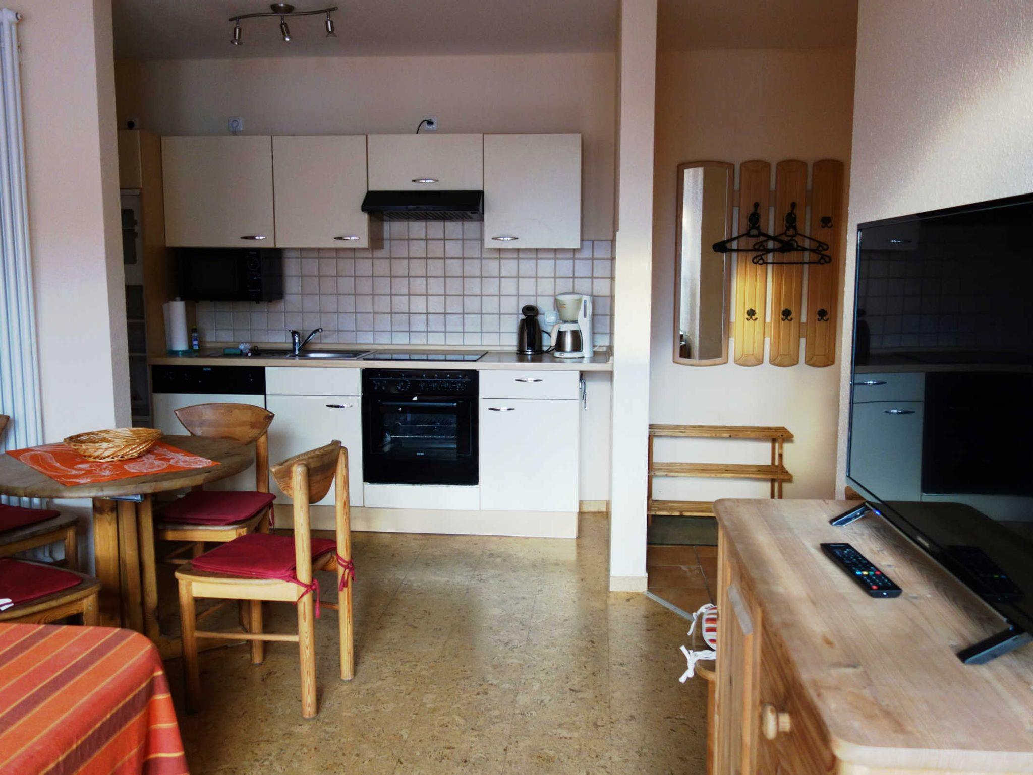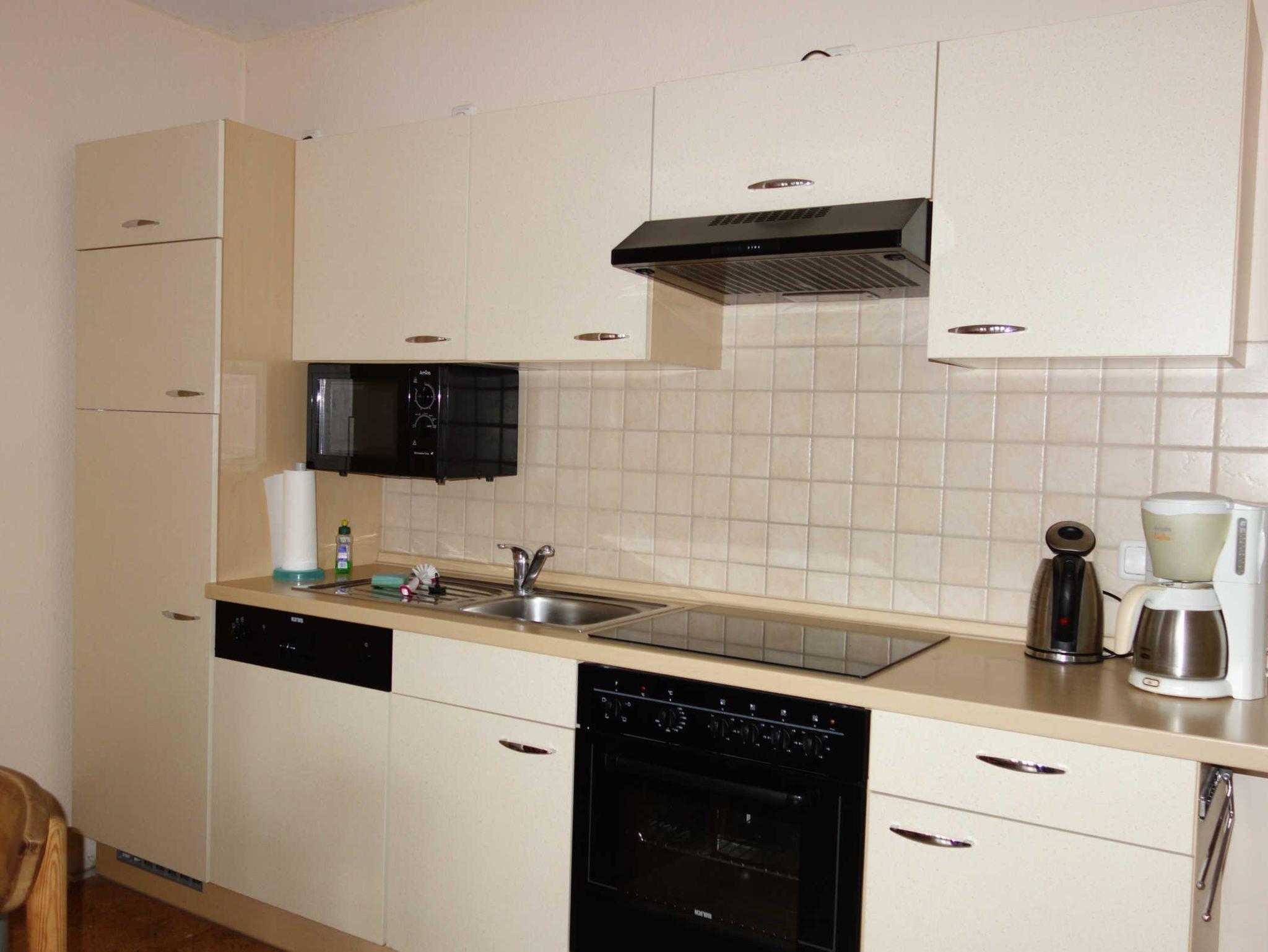 Die offene Küche verfügt über ein Cerankochfeld (4 Kochfelder), einen Kühlschrank mit Gefrierfach, einen Geschirrspüler, einen Backofen, eine Mikrowelle, einen Wasserkocher und eine Kaffeemaschine sowie über einen Esstisch mit 4 Stühlen.