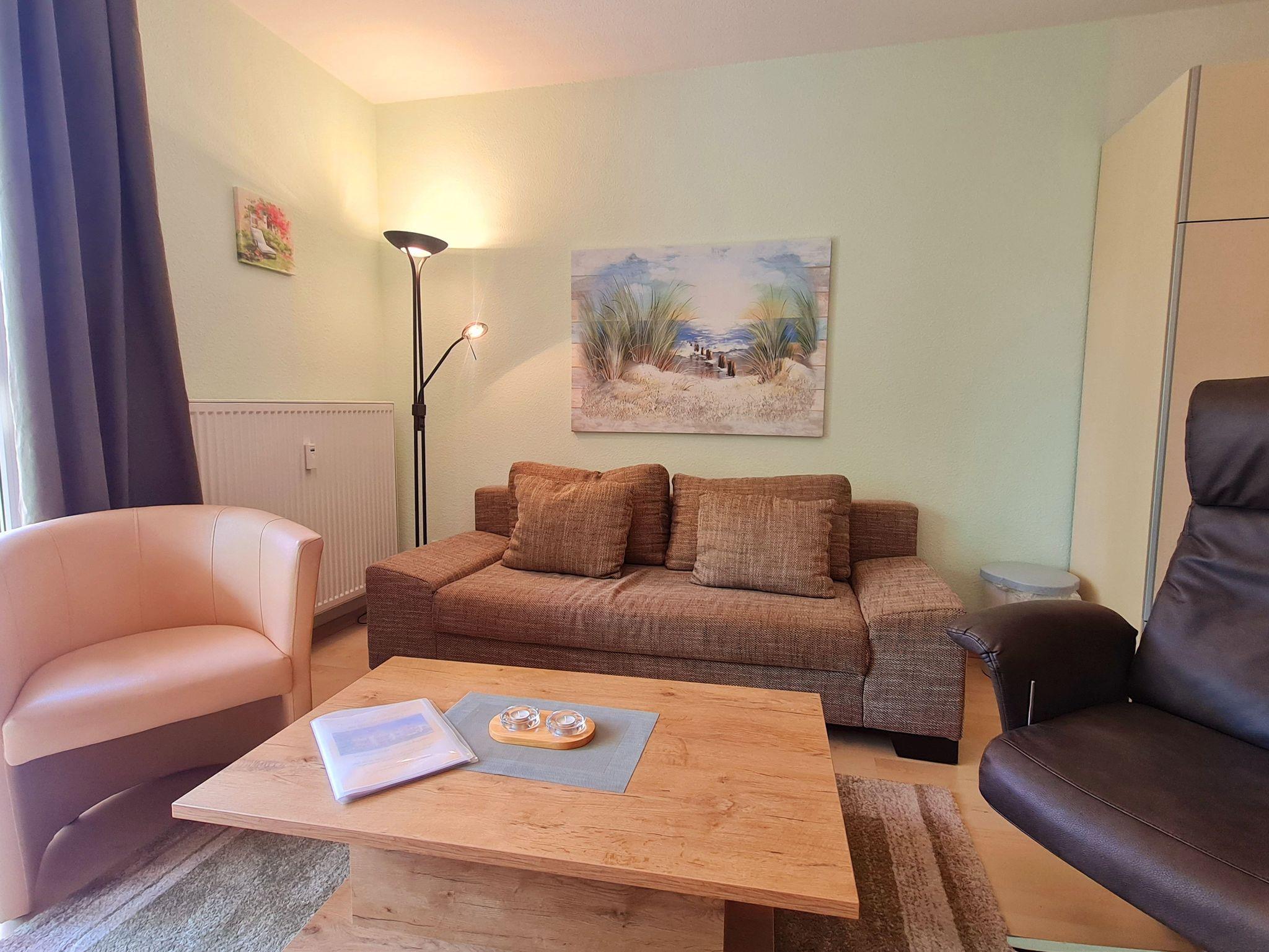 Nur 350m vom Strand entfernt liegt diese gemütlich und modern eingerichtete 2-Raum-Wohnung im Erdgeschoss mit ca. 48 m² Wohnfläche und einer sonnigen Südterrasse. Die sehr helle und freundliche Wohnung kann mit bis zu 4 Personen genutzt werden. Ein separates Schlafzimmer und eine 1,50x2,00 m große Schlafcouch, bieten Platz für 4 Personen. Praktisch erreichbar befindet sich vor dem Objekt ein abschließbarer Abstellraum der bis zu 4 Fahrrädern Platz o.ä. bietet. Der Wohnung ist der kostenlose Stellplatz 2 zugeordnet. WLAN steht kostenlos zu Verfügung.