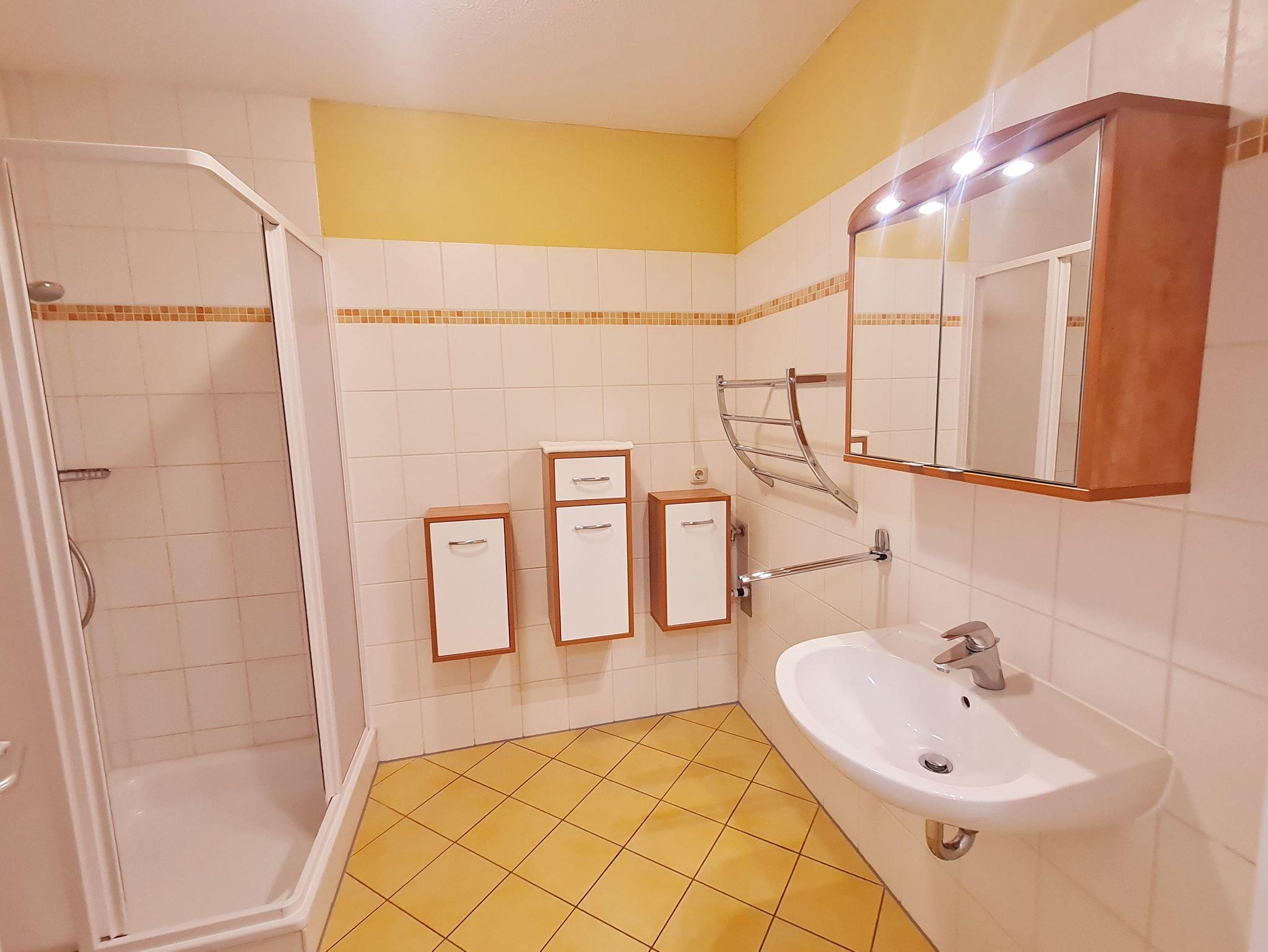 • Bad: ohne Fenster, Dusche, Waschbecken, Toilette, Spiegelschrank,