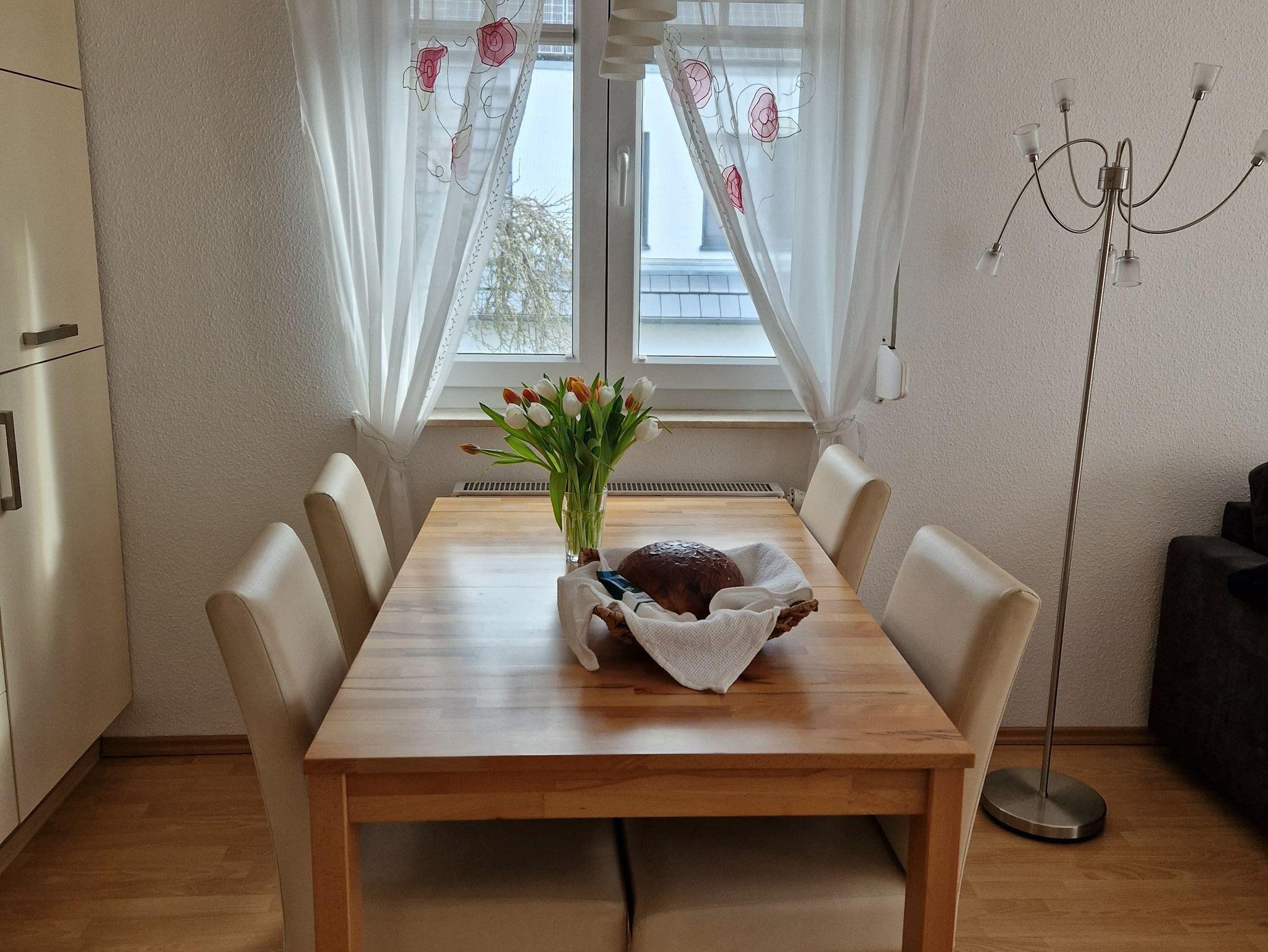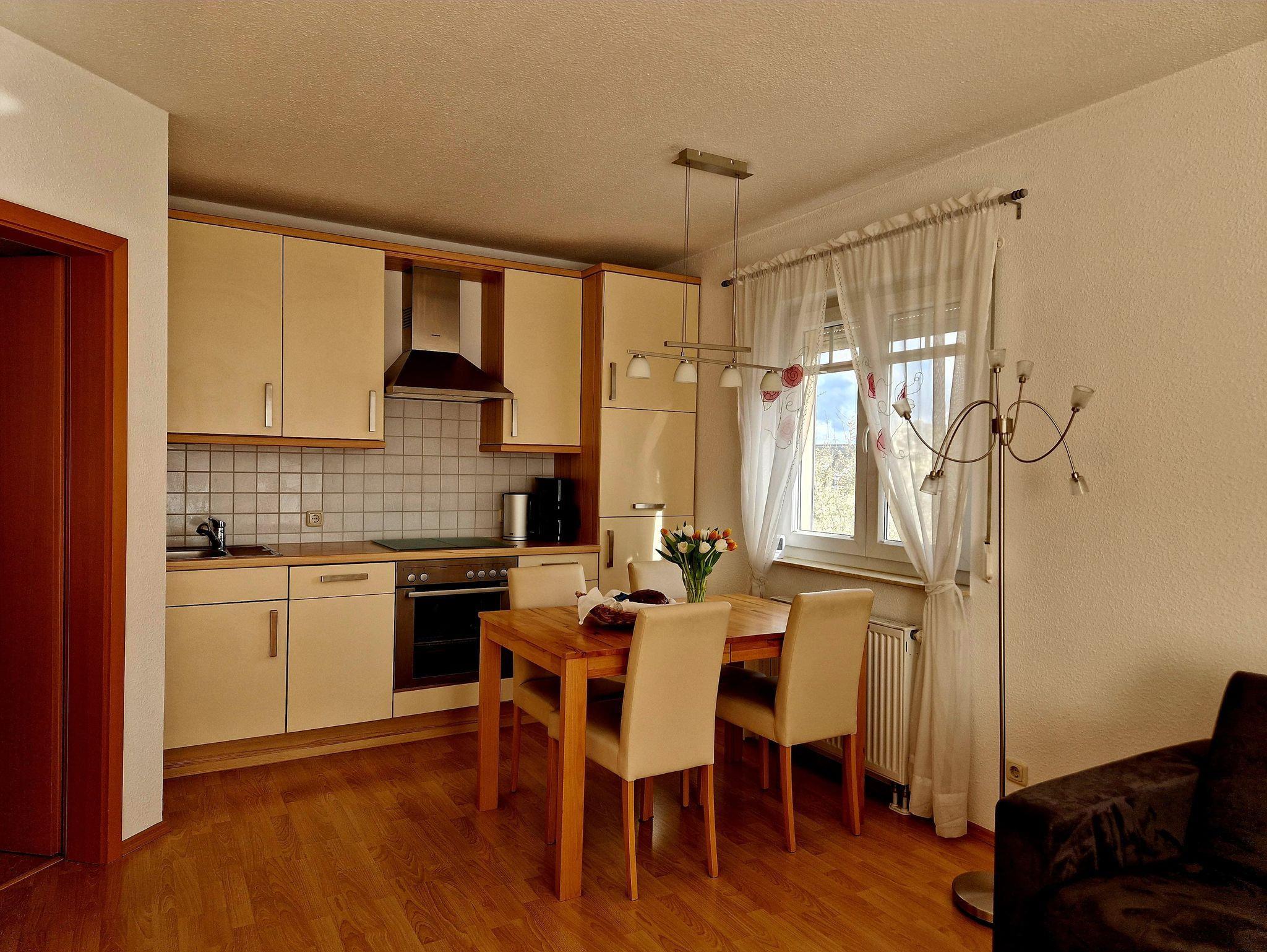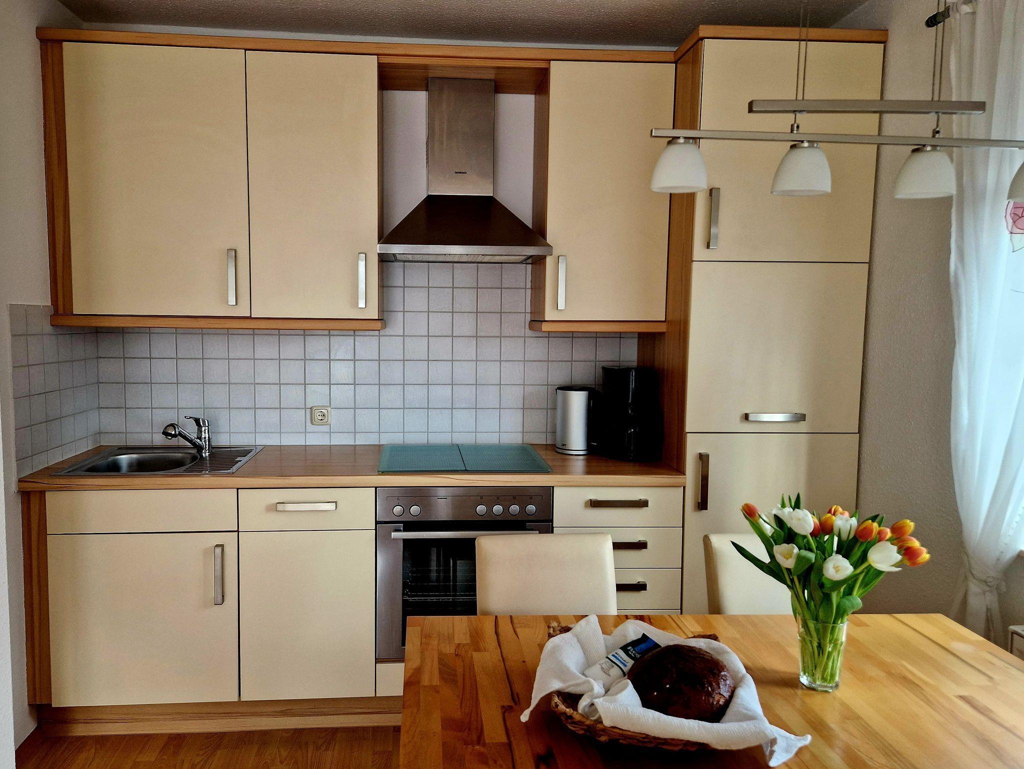 • Küche: offene Wohnküche und Essbereich für 4 Personen, komplett eingerichtete Einbauküche mit Backofen, Cerankochfeld, Geschirrspüler, Kühlschrank mit Gefrierfach, Mikrowelle, Wasserkocher, Kaffeemaschine, Toaster