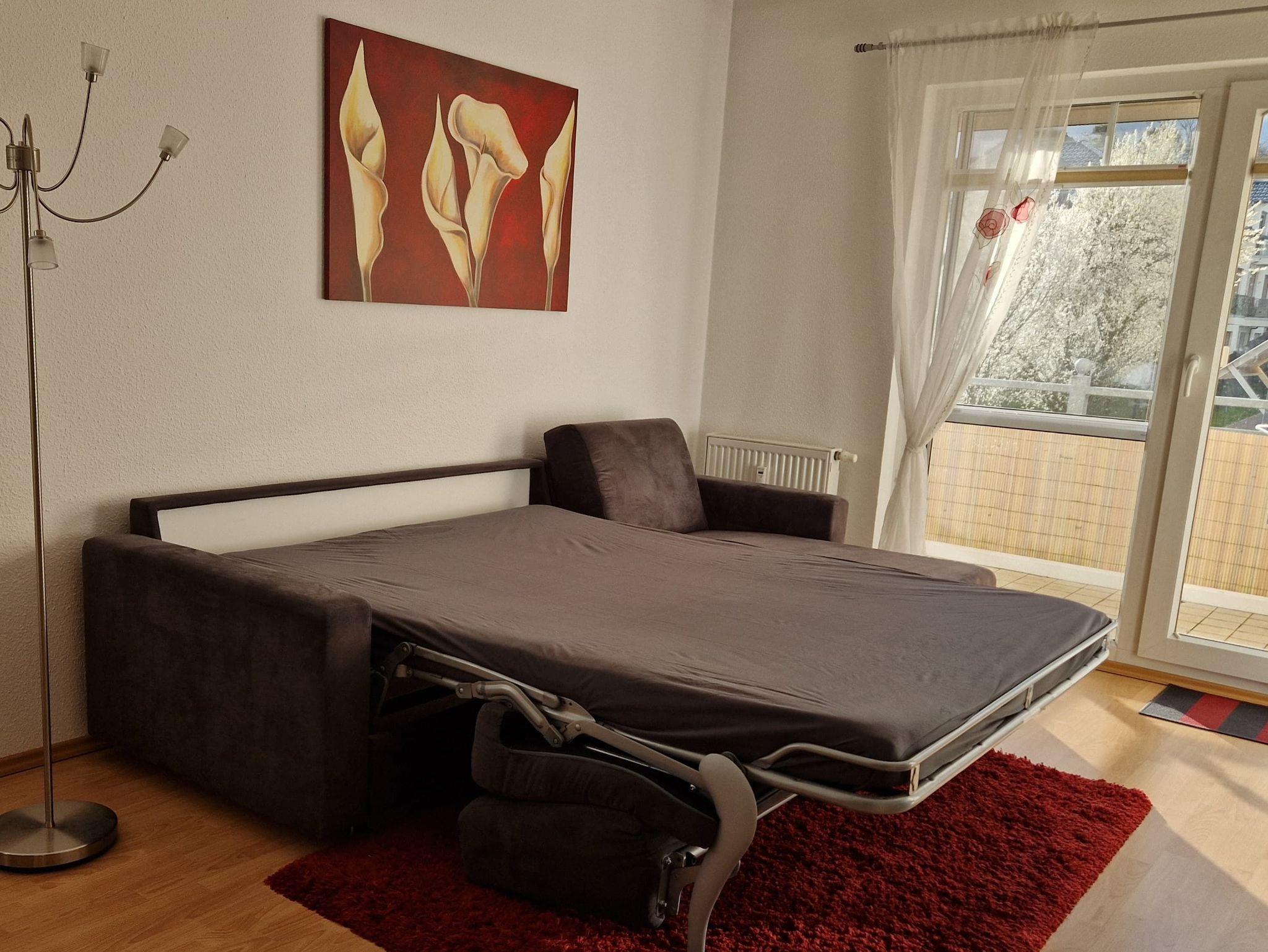 • Wohnzimmer: Gemütliche Schlafcouch aus Textil mit einer Fläche von 140x200 cm, Tisch, Sideboard, TV, DVD-Player, CD-Radio, Leselampe