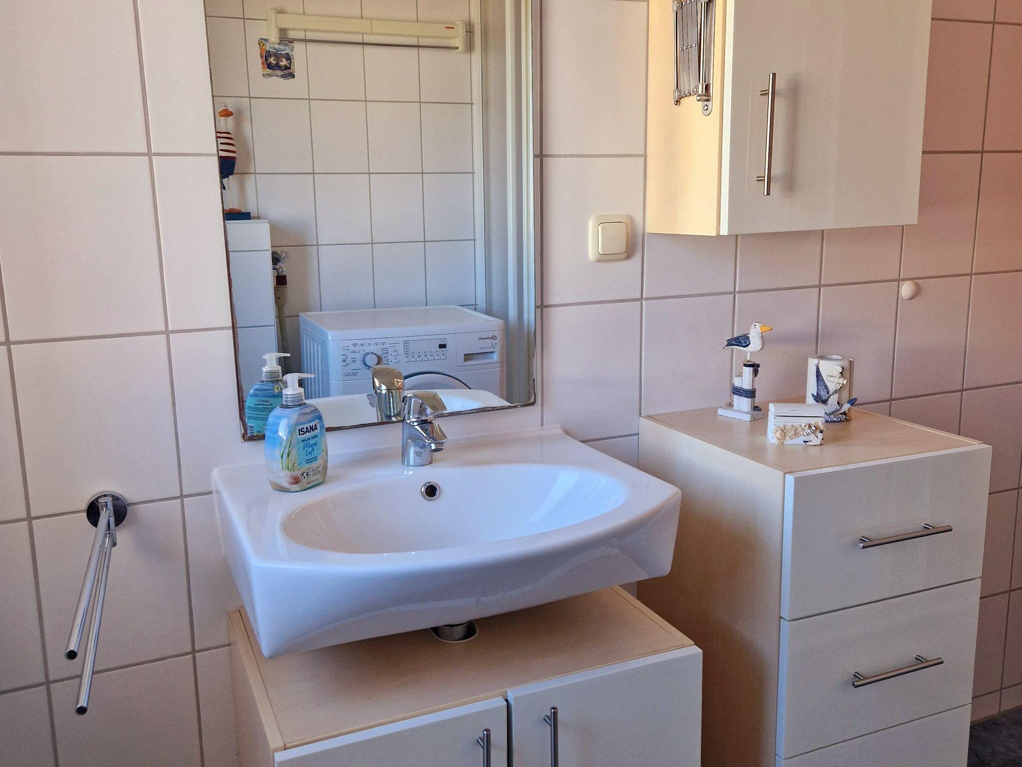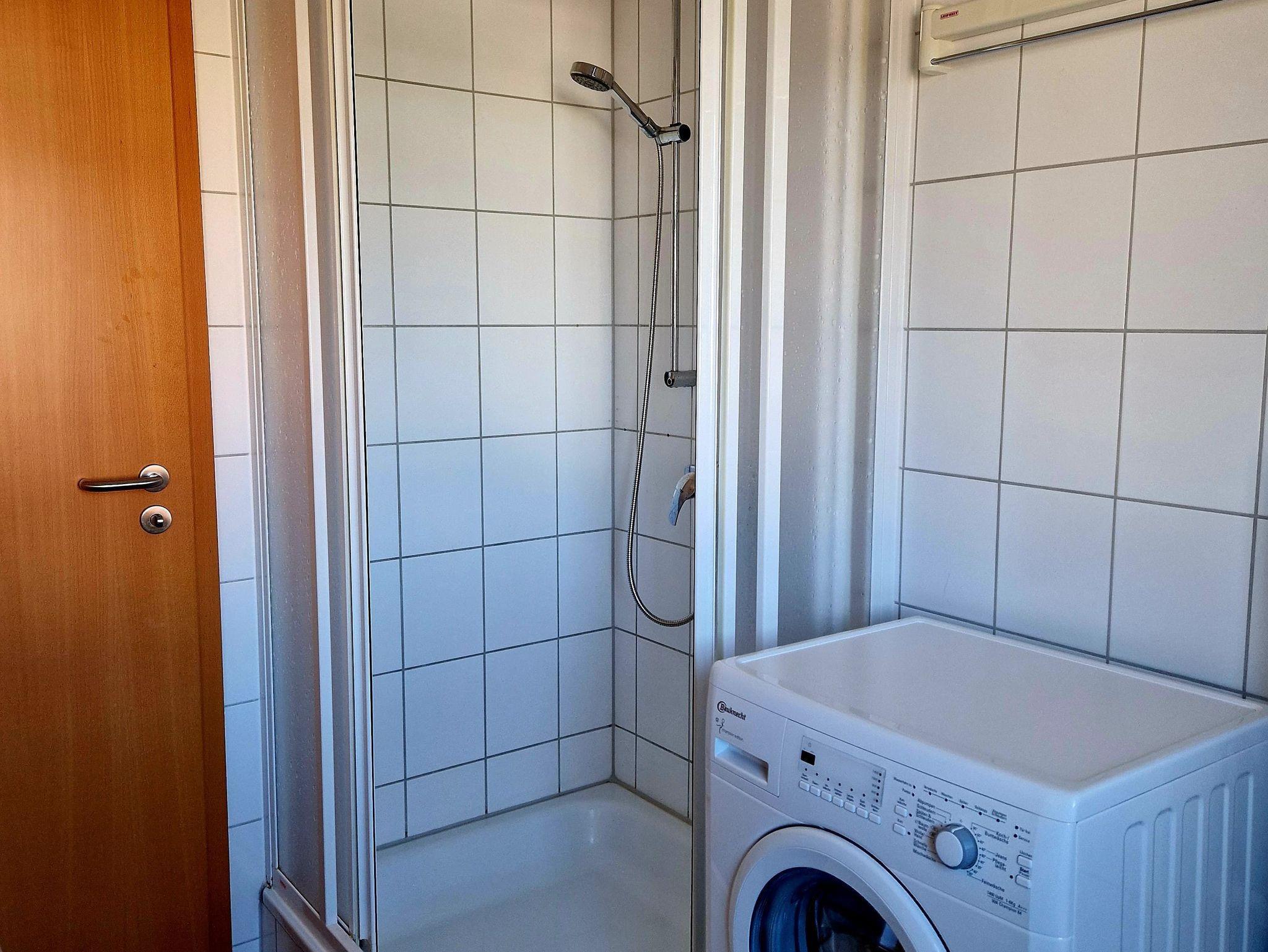 • Bad: mit Fenster, Dusche, Waschbecken, Toilette, Schränke, Handtuchhalter, Waschmaschine