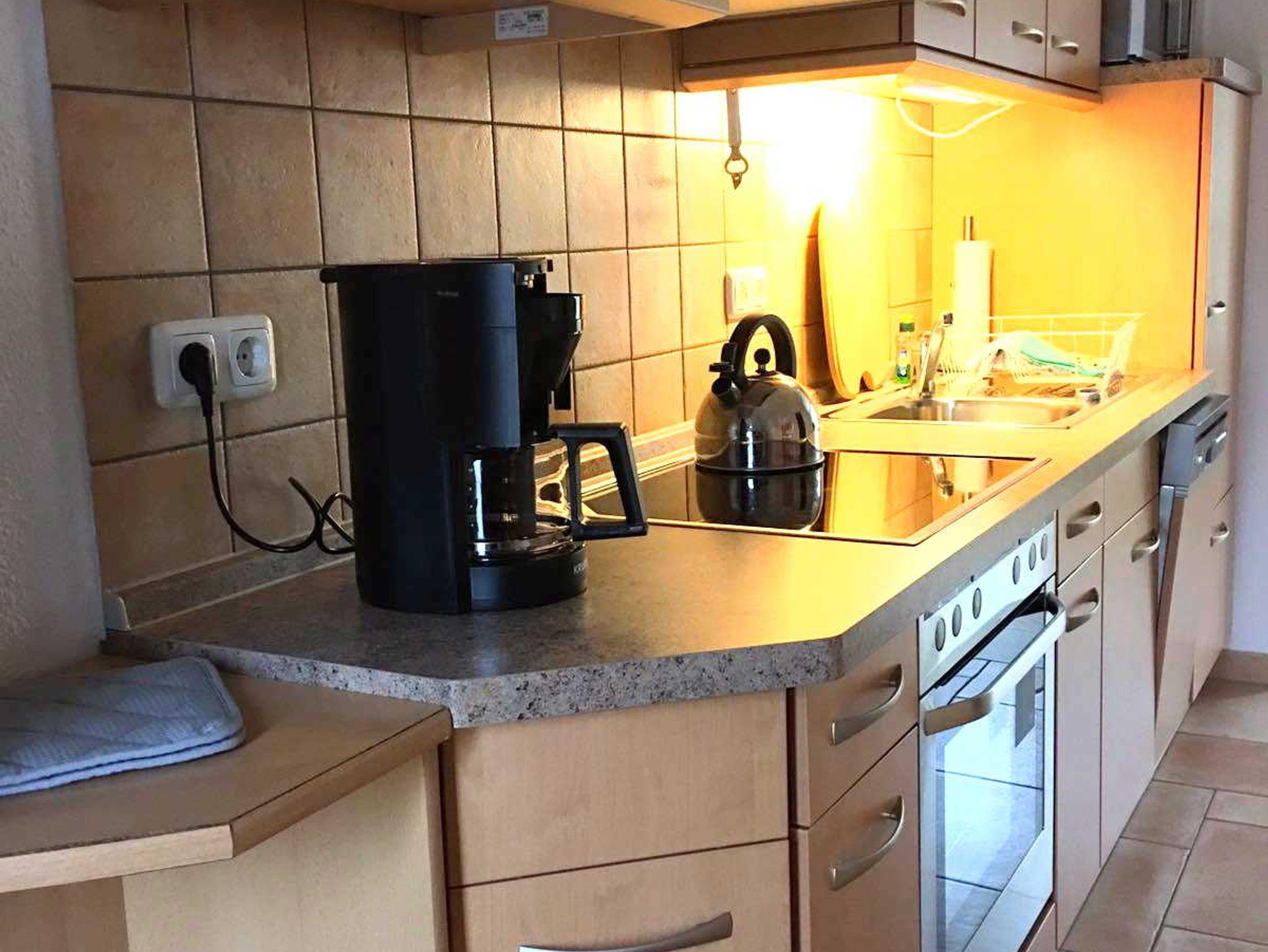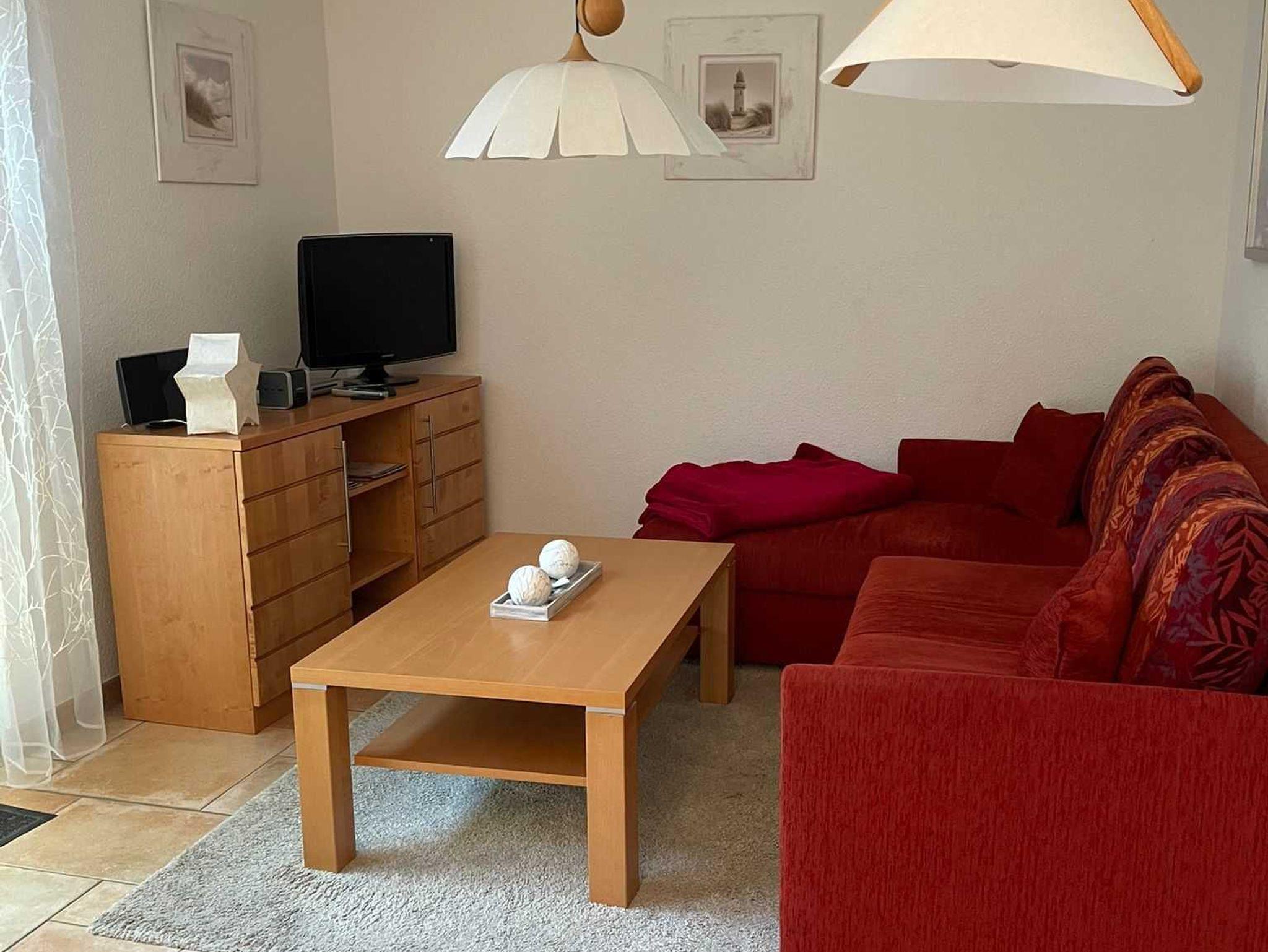 Die Ferienwohnung bietet ein Schlafzimmer mit Doppelbett und Schrank. Im offenen Wohn- und Küchenbereich gibt es u.a. eine bequeme Sitz- und Schlafcouch, einen Flachbild-Fernseher, einen Esstisch und eine Einbauküche mit Backofen, Geschirrspüler und Mikrowelle. Das Badezimmer ist mit Dusche/WC und Handtuchtrockner ausgestattet.