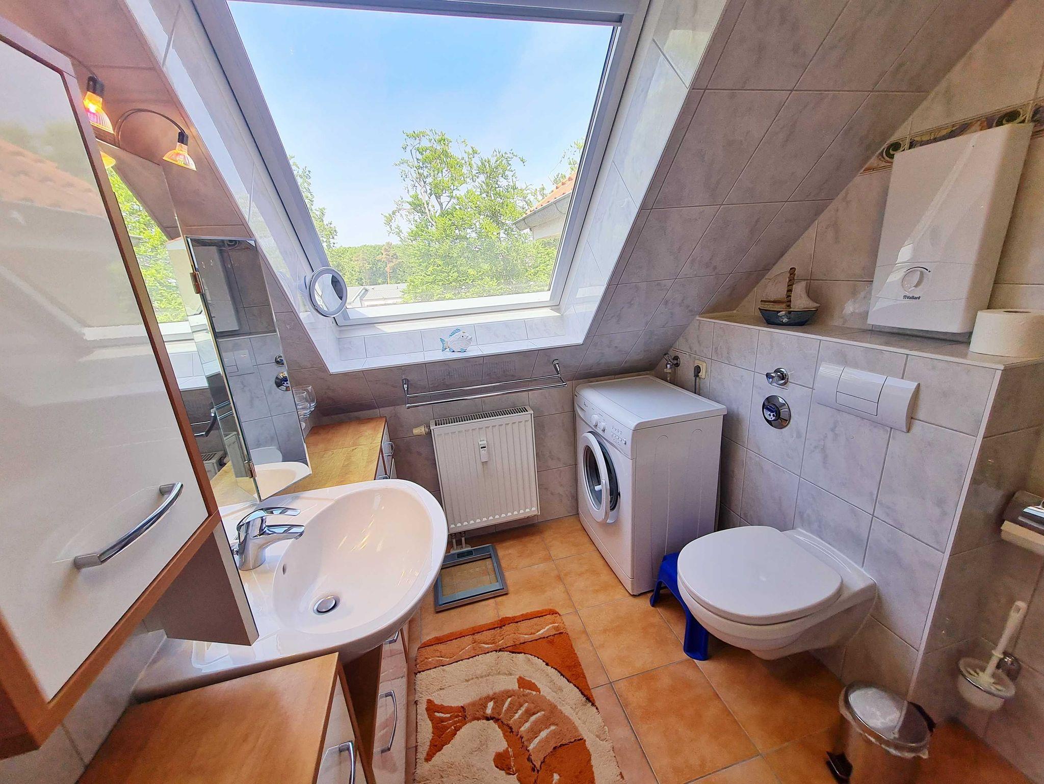 • Bad: mit Fenster, Dusche, Waschbecken, Toilette, Spiegel, Badezimmerschränke, Handtuchhalter, Waschmaschine, Tritt, Waage