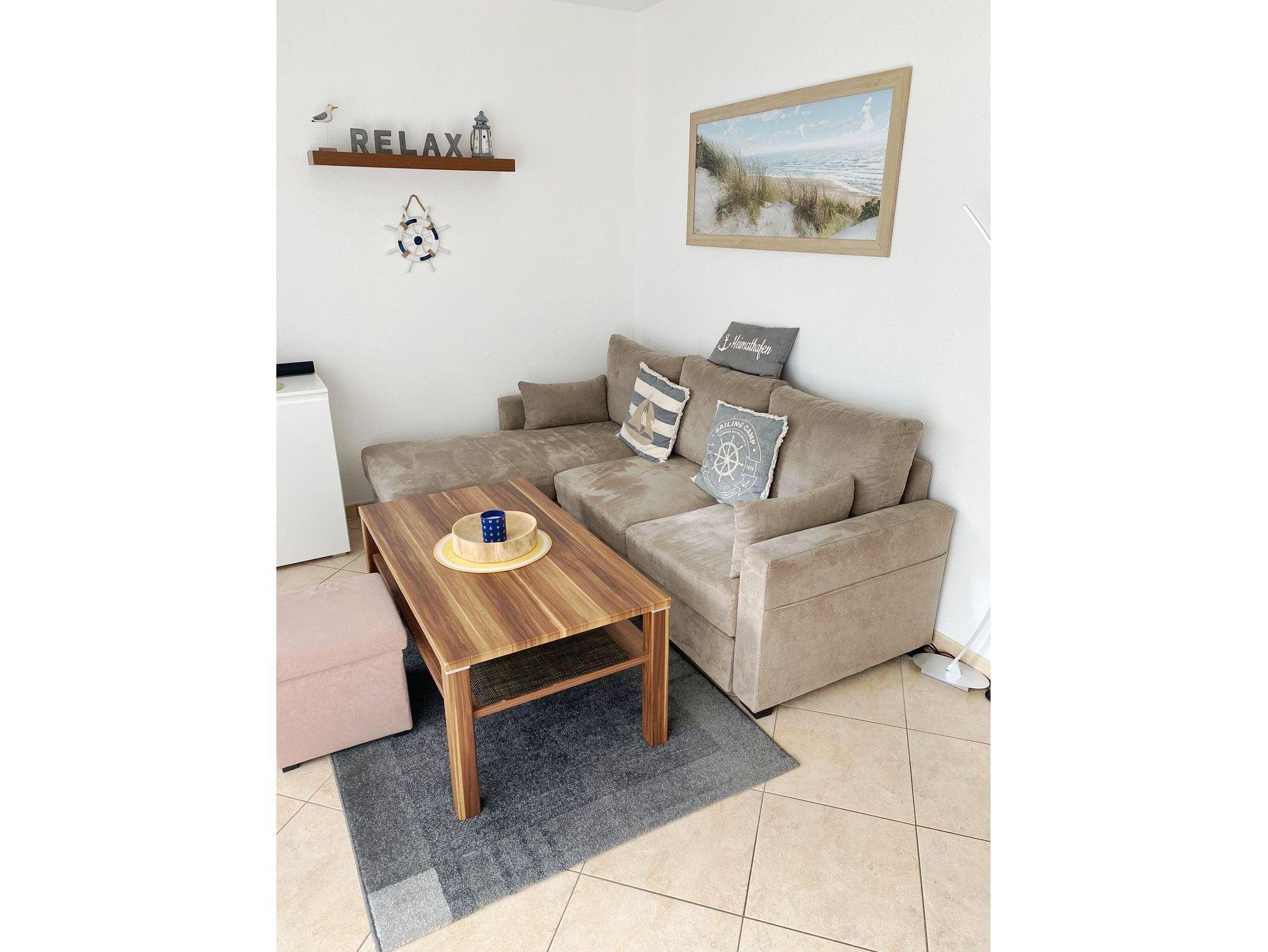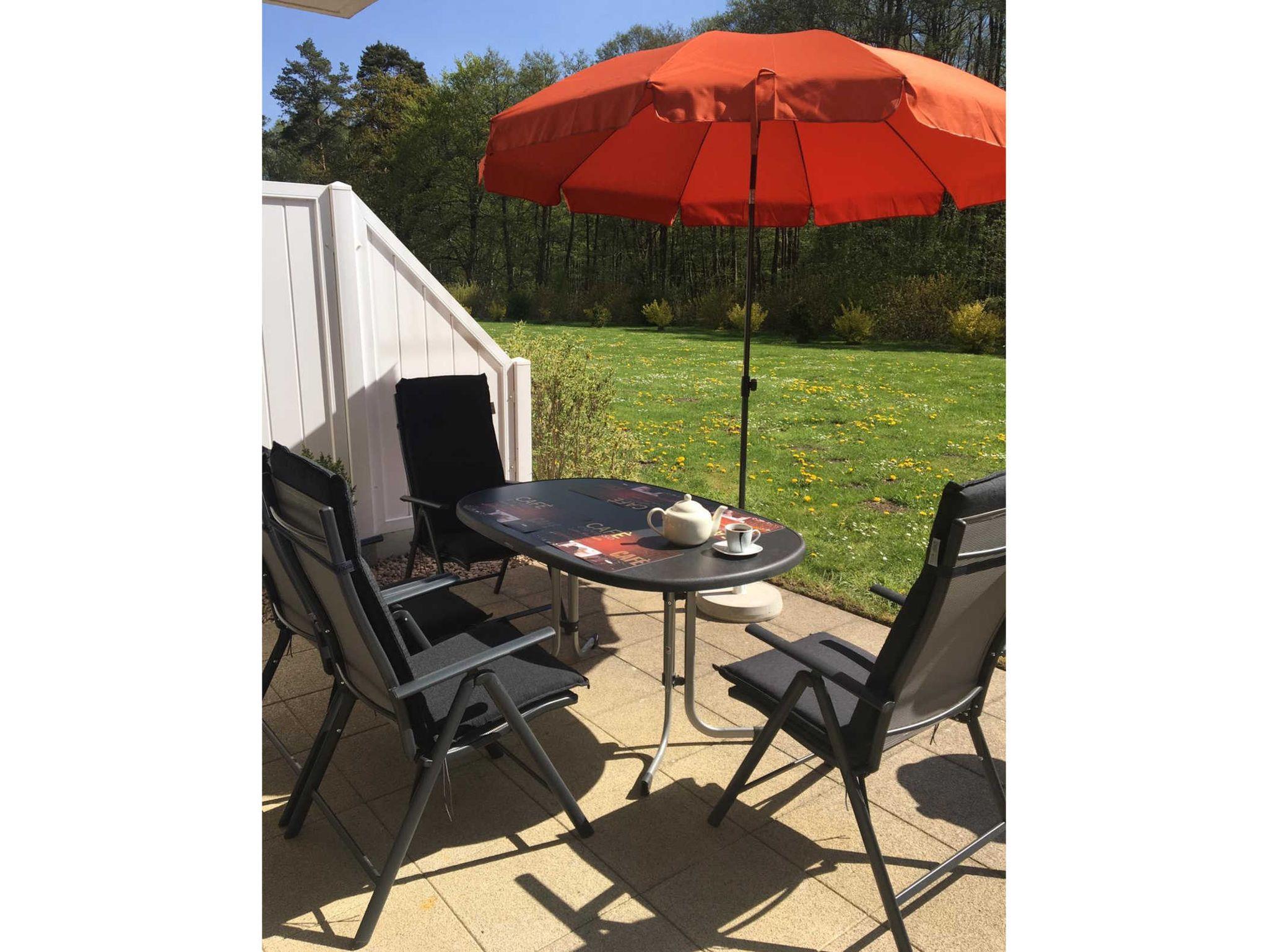 Zu der Ferienwohnung gehören eine große Terrasse mit Gartenmöbeln sowie einem Strandkorb und ein PKW-Stellplatz sowie eine Abstellbox (Abstellmöglichkeit für Fahrräder).