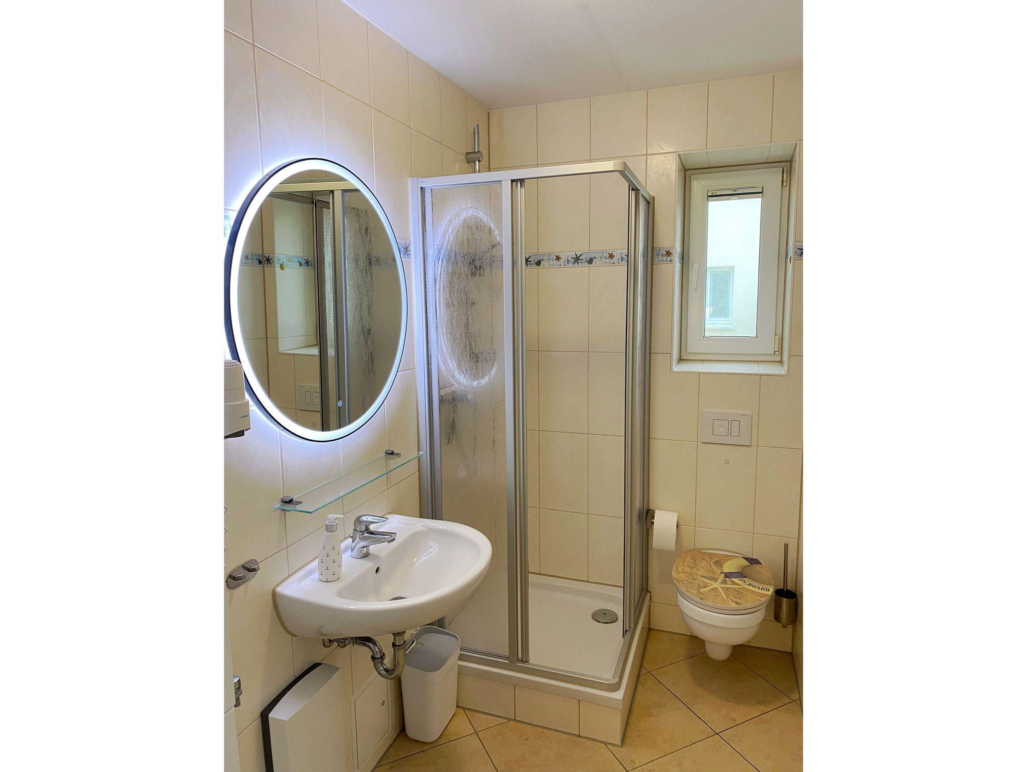 Das Bad mit Fenster hat eine Dusche und ein WC sowie einen festinstallierten Fön.