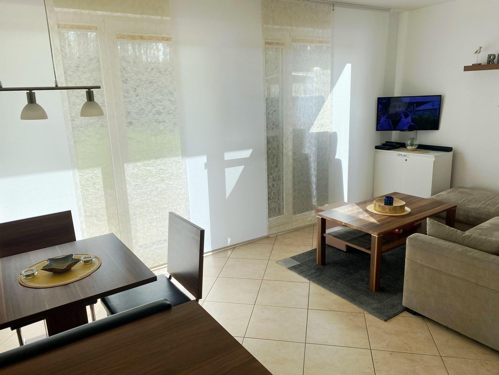 2 Zimmer Ferienwohnung im Ferienwohnpark Küstenwald mit Terrasse, Schlafzimmer, Küchenzeile, Bad mit Dusche und WC, Wohnzimmer mit Couch und Flachbild-TV, PKW-Stellplatz, W-LAN
