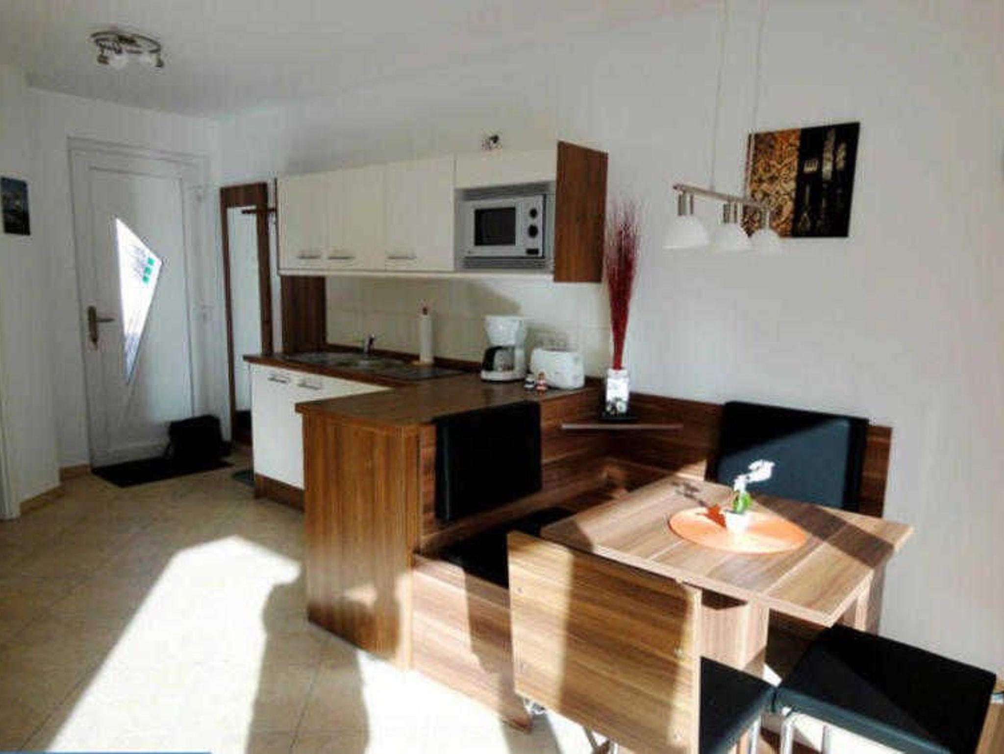 Die in das Wohnzimmer integrierte Küche ist u.a. mit einem Kühlschrank, einer Mikrowelle, zum Kochen 2 Ceranfeldern, einem Wasserkocher, einem Toaster und einer Kaffeemaschine sowie einem Esstisch mit einer Eckbank und 2 Stühlen ausgestattet.