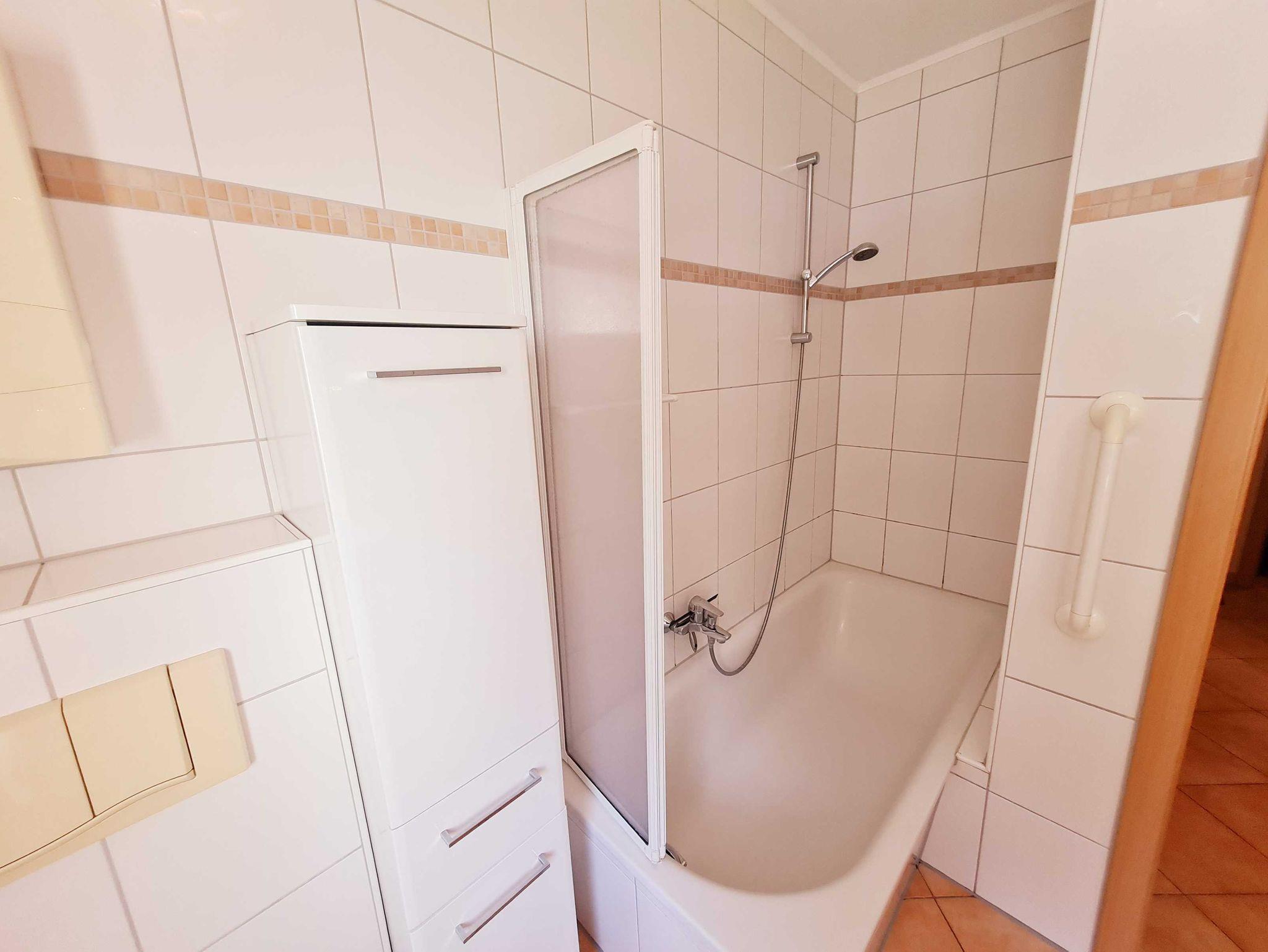 • Bad: mit Fenster, tiefergelegte Badewanne mit Duschabtrennung, Waschbecken, Toilette, Schränke, Handheizkörper, Fön, Waschmaschine ( im Außenabstellraum)