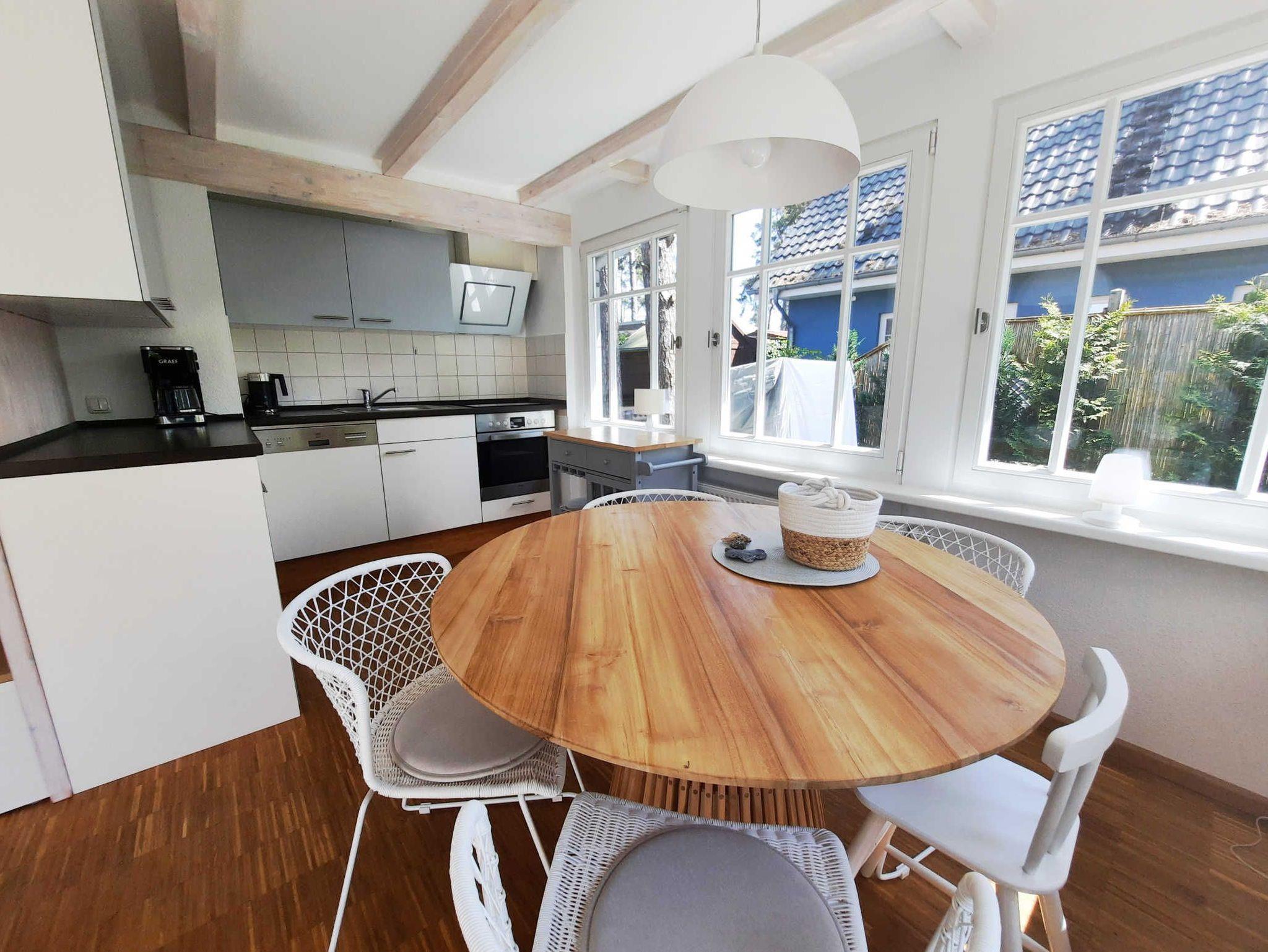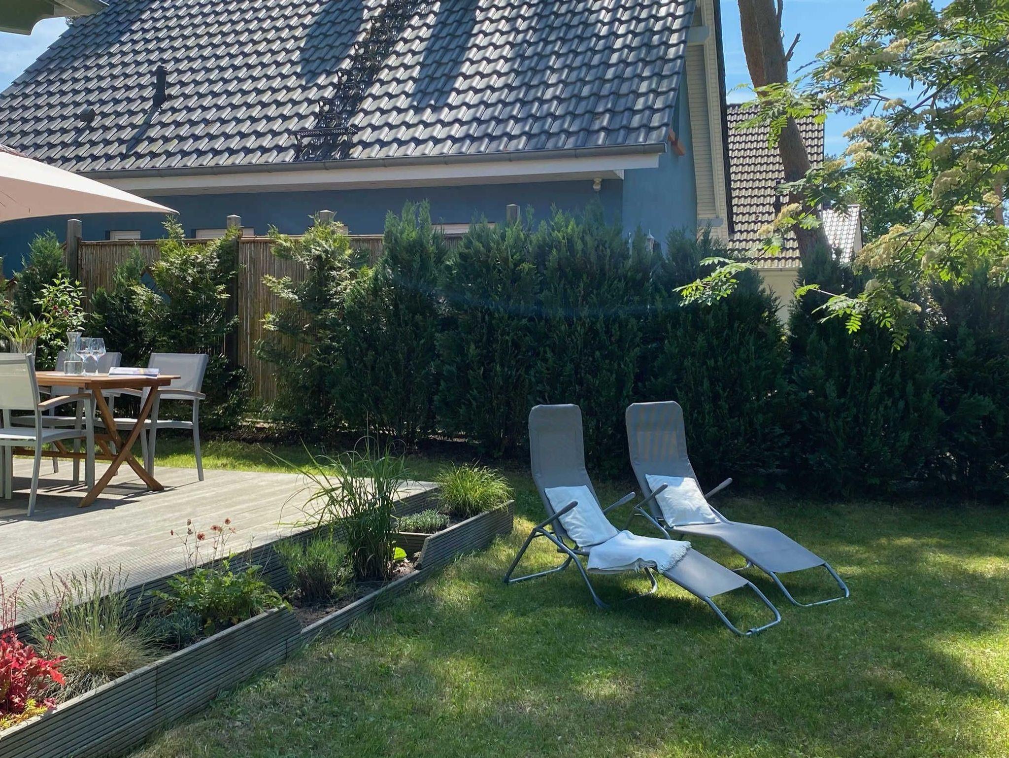70m² großes Ferienhaus mit Terrasse für bis zu 5 Personen mit optional nutzbarer Fasssauna. Die Unterkunft liegt ruhig im Ortsteil Graal nahe dem Küstenwald.