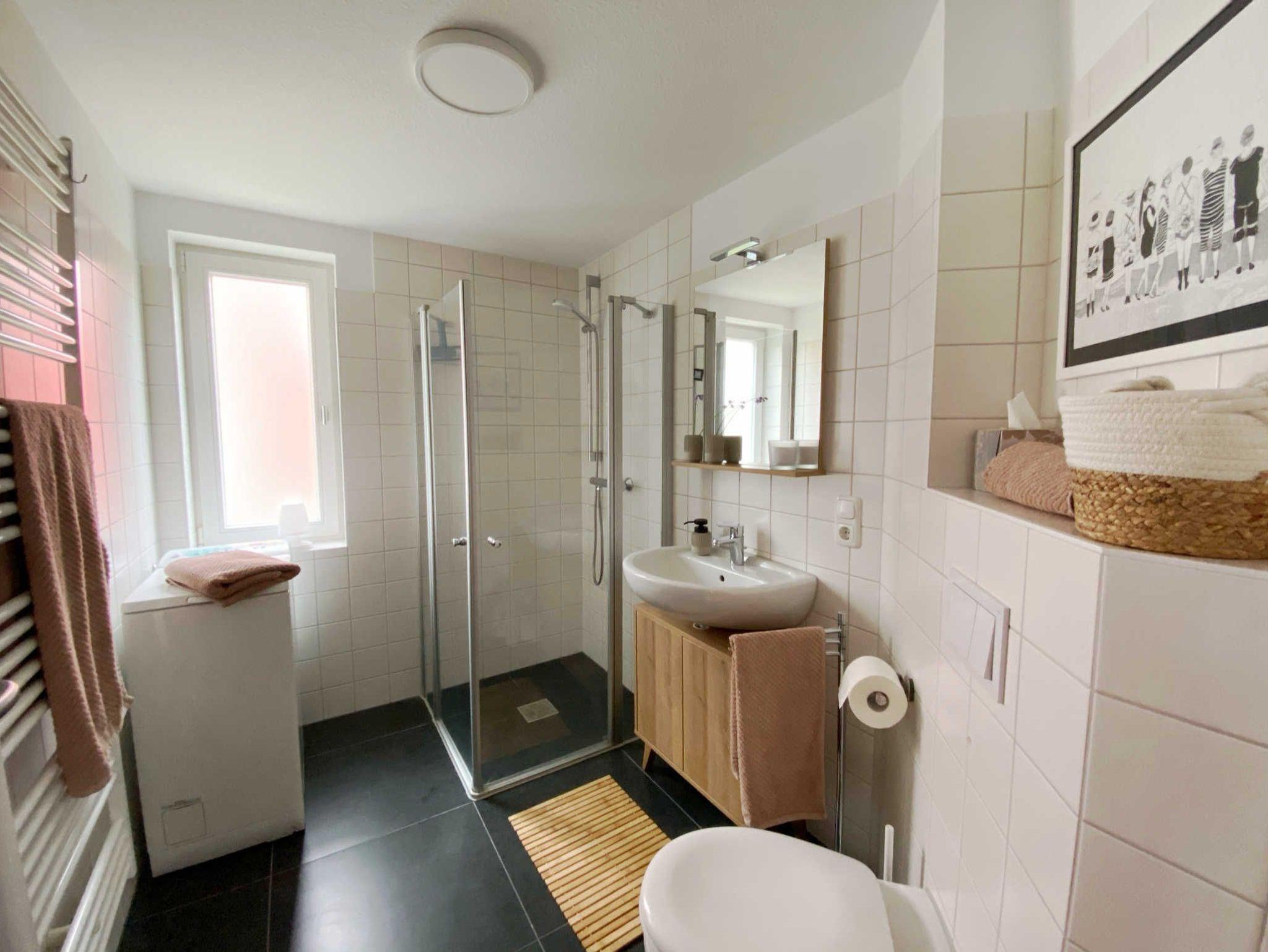 • Bad: ebenerdige Dusche, WC, Waschbecken, Fenster