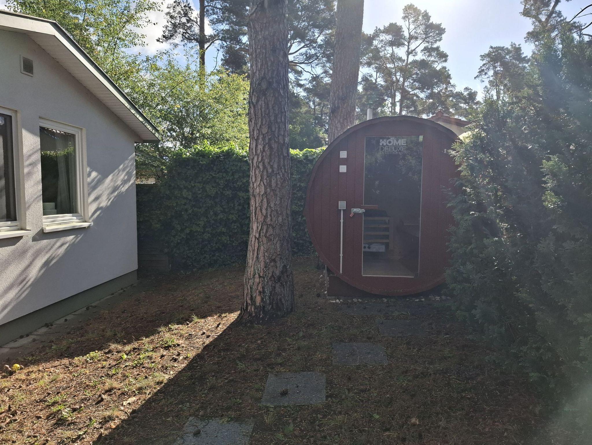 Gegen Gebühr können Sie in einer Garten Fass-Sauna auf dem Grundstück entspannen. Einmalig fallen für die Benutzung der Sauna 25 € an.