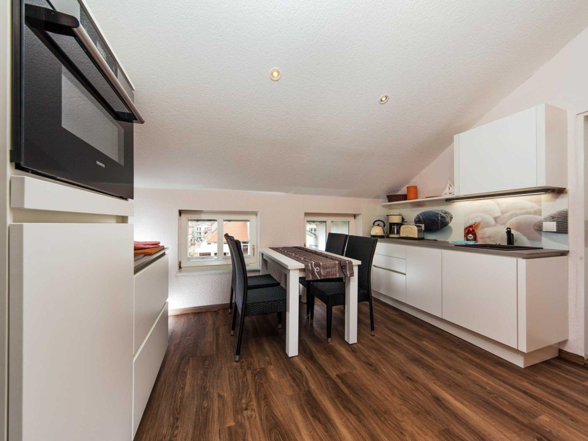 Ein lauschiges Urlaubsnest für 2 Personen. Dieses Appartement, direkt unterm Dach, bietet unseren Feriengästen einen kombinierten Wohn- und Schlafbereich mit zwei gemütlichen Sesseln, eine vollausgestattete Küche mit Essplatz für ein gemütliches Mahl sowie ein Badezimmer mit Dusche, Waschtisch, WC, Handtuchheizkörper und Föhn.