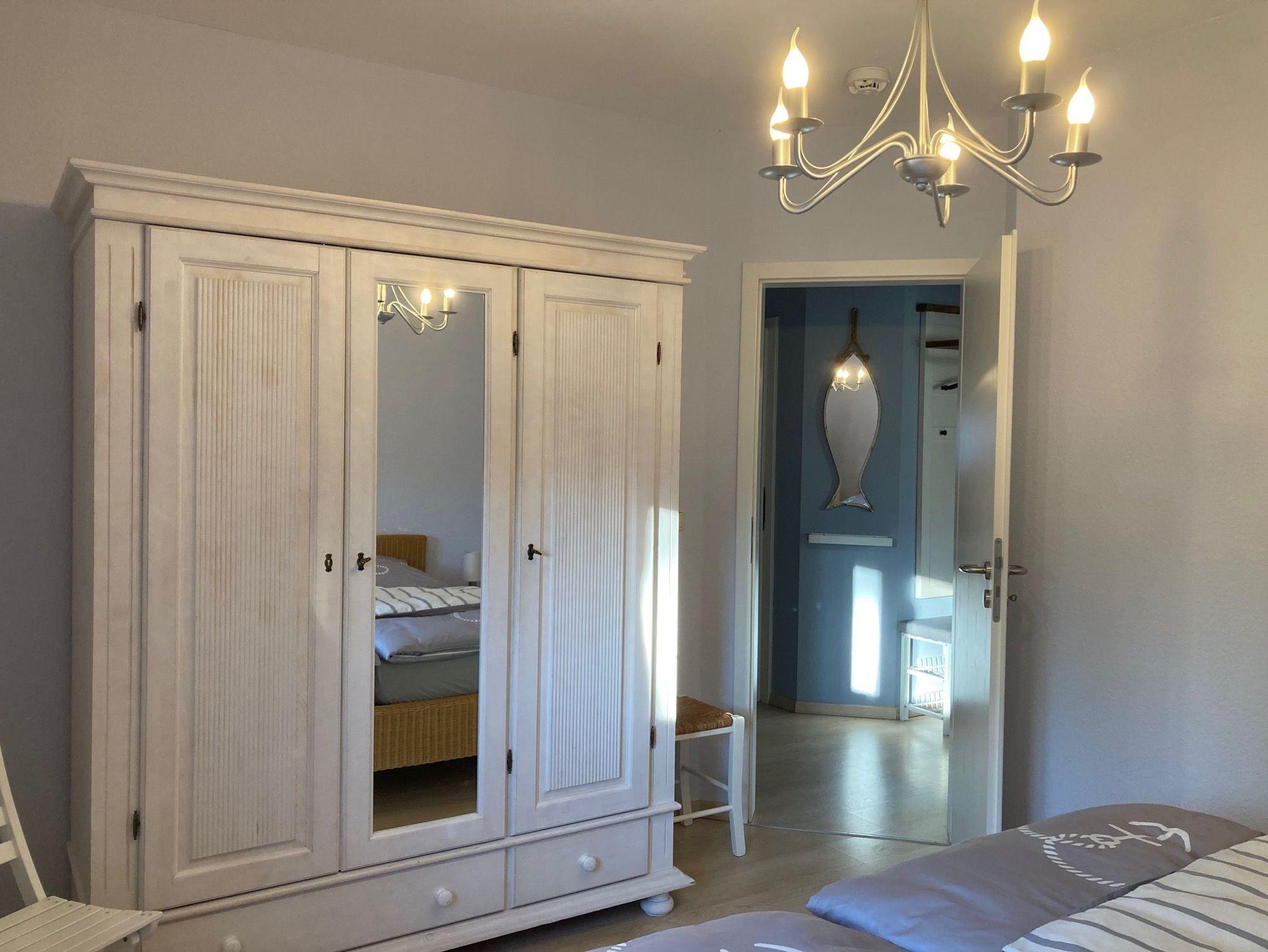 • Schlafzimmer: Doppelbett mit zwei Einzelmatratzen 90x200 m, Schrank, Nachttische + Lampen, Stuhl, Hocker, Fliegengitter an Fenster, Verdunklungsrollo