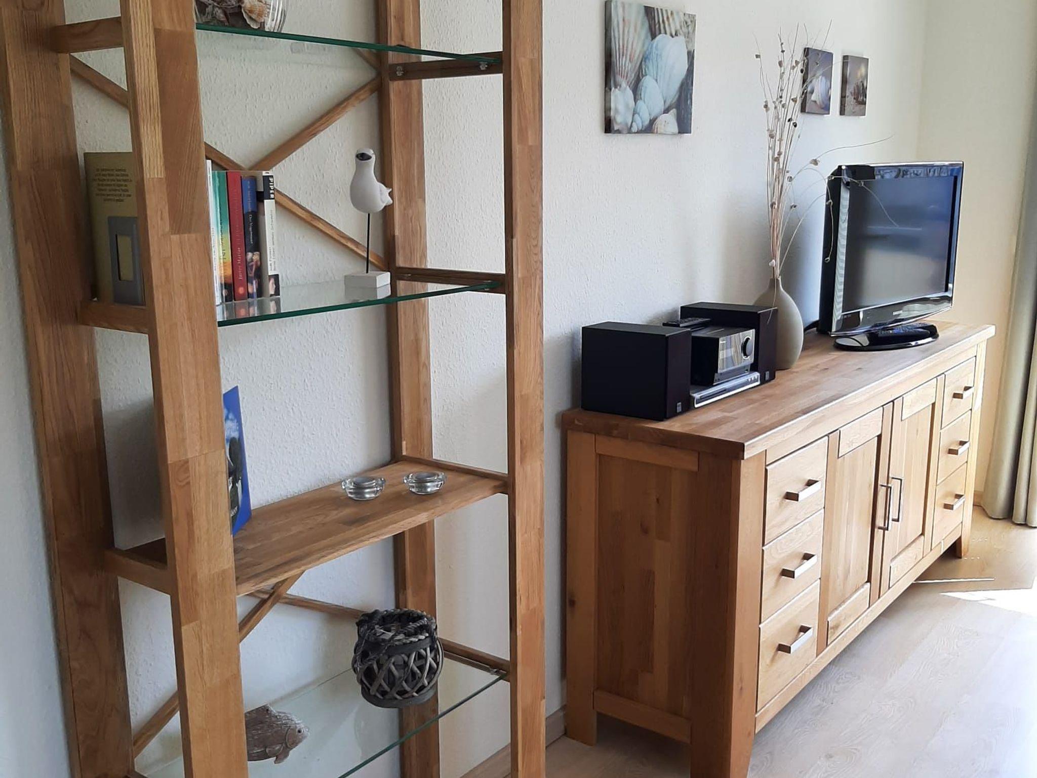 • Wohnzimmer: gemütliche Schlafcouch aus Textil 150x200 cm, TV-Flachbild, Sideboard, Tisch, Sessel,CD-Radio, Leselampe, Spiele, Bücher