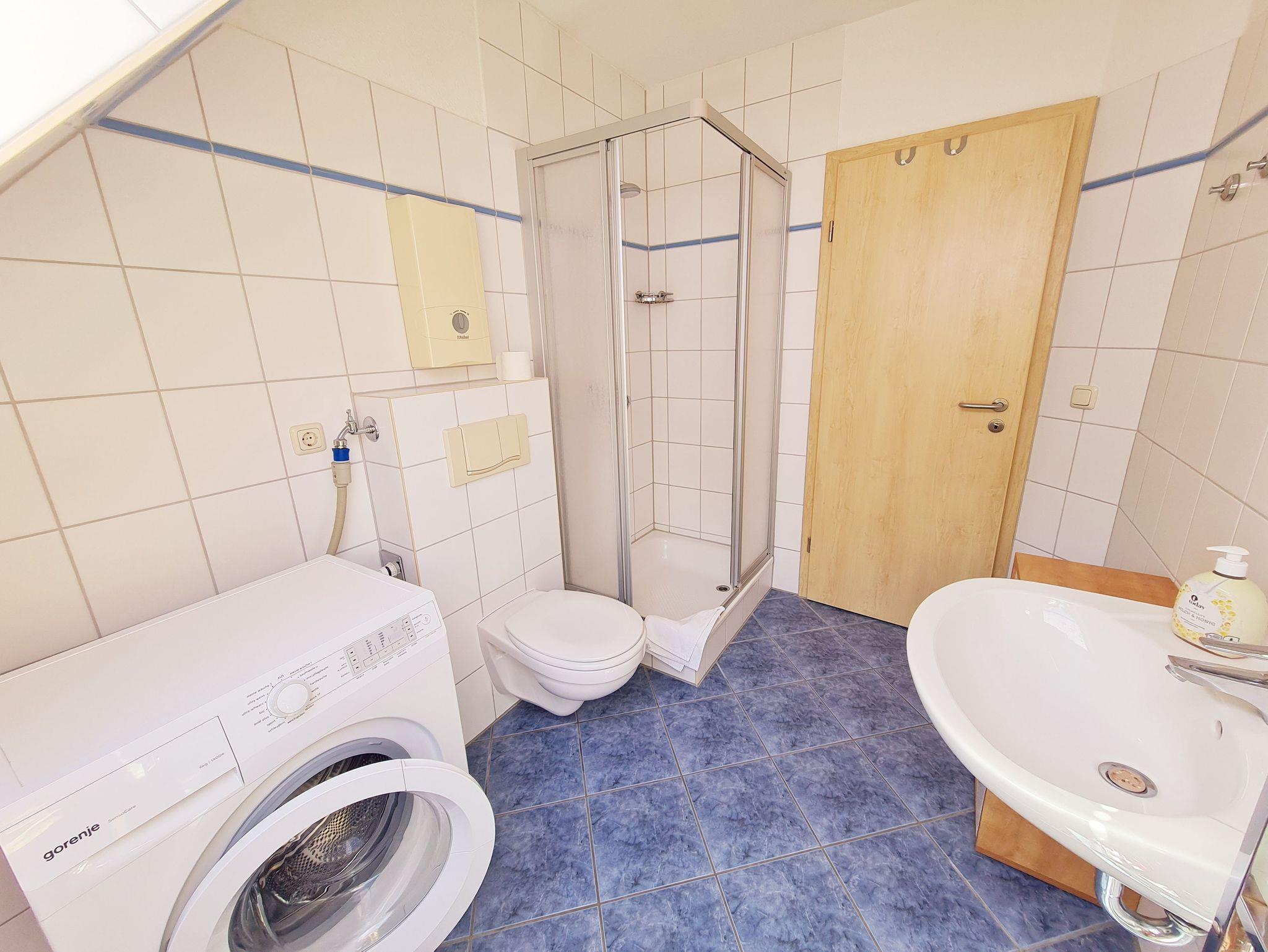 • Bad: mit Fenster, Dusche, Waschbecken, Toilette, 2 kl. Schränke, Regal, Handtuchhalter, Waschmaschine