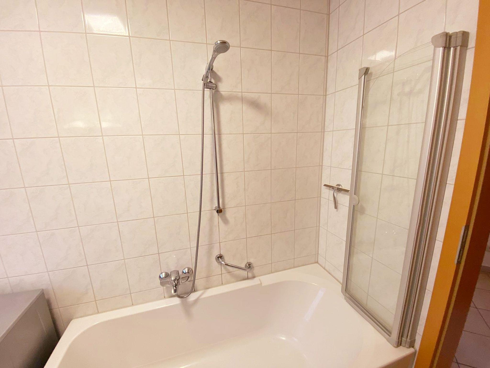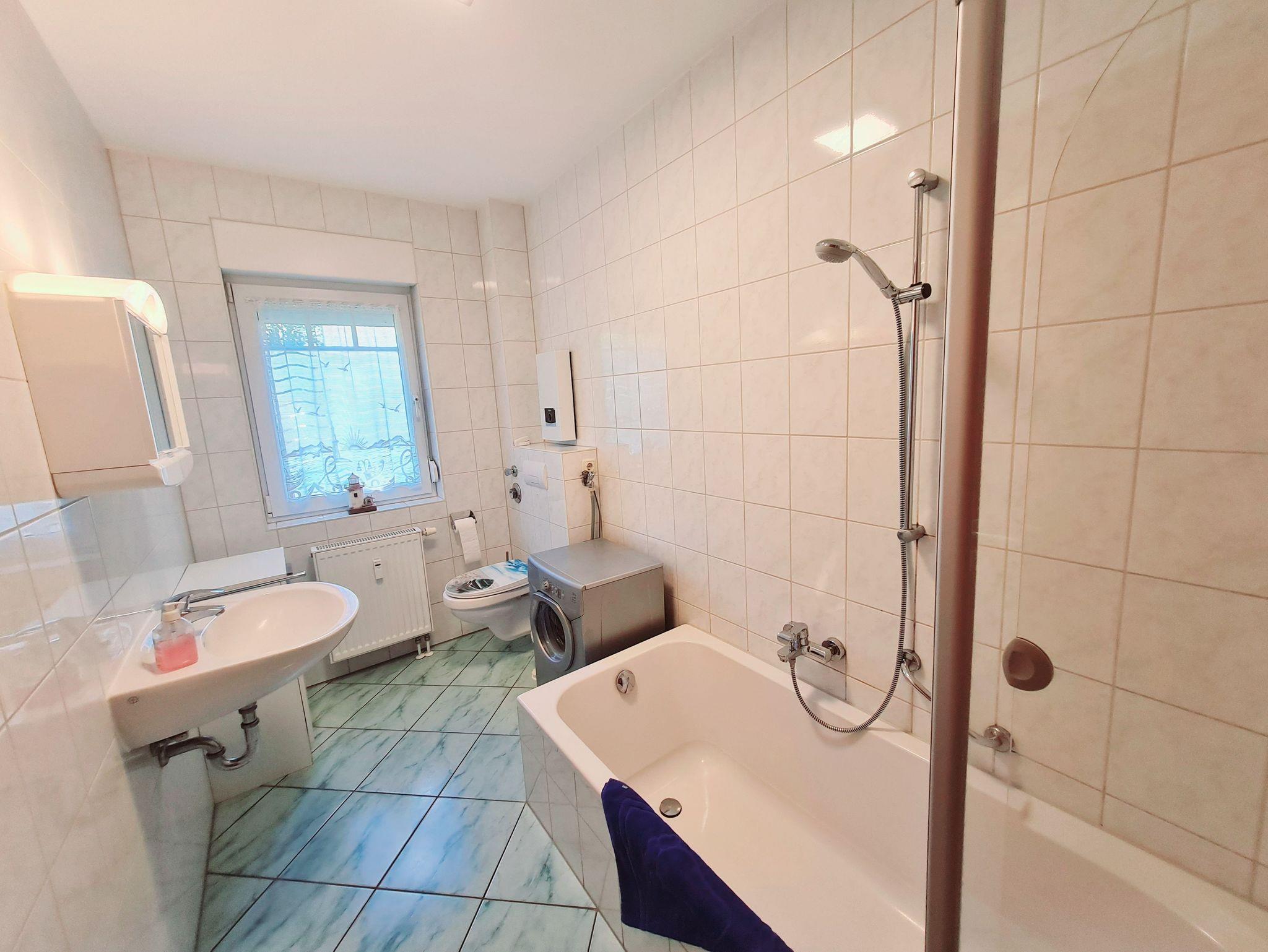 • Bad: mit Fenster, Badewanne mit Duschwände, Waschbecken, Toilette, Spiegelschrank, Schrank, Waschmaschine