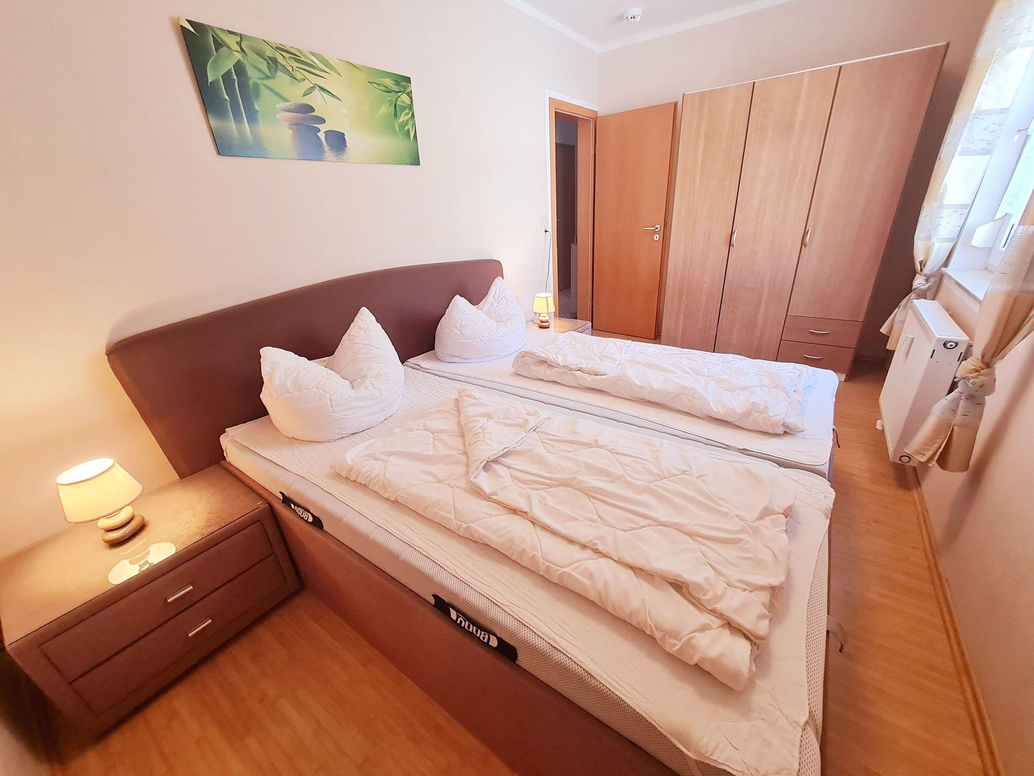 • I Schlafzimmer: Doppelbett mit zwei Einzelmatratzen 90x200 cm, 3-türiger Schrank, Nachttische, Lampen,