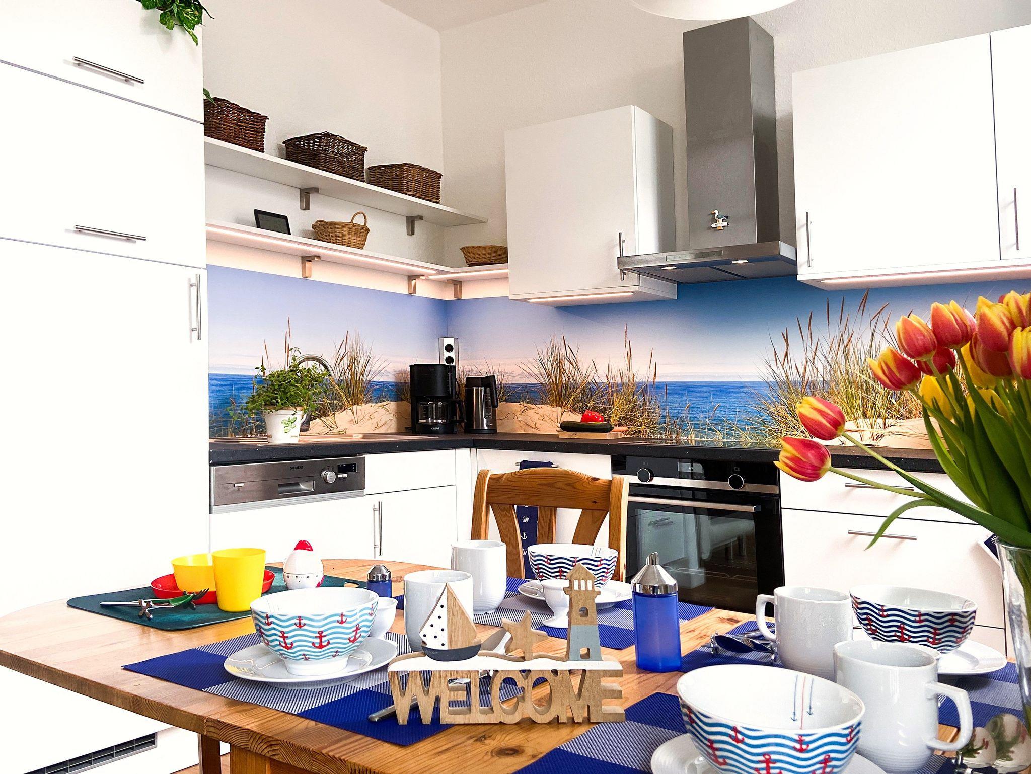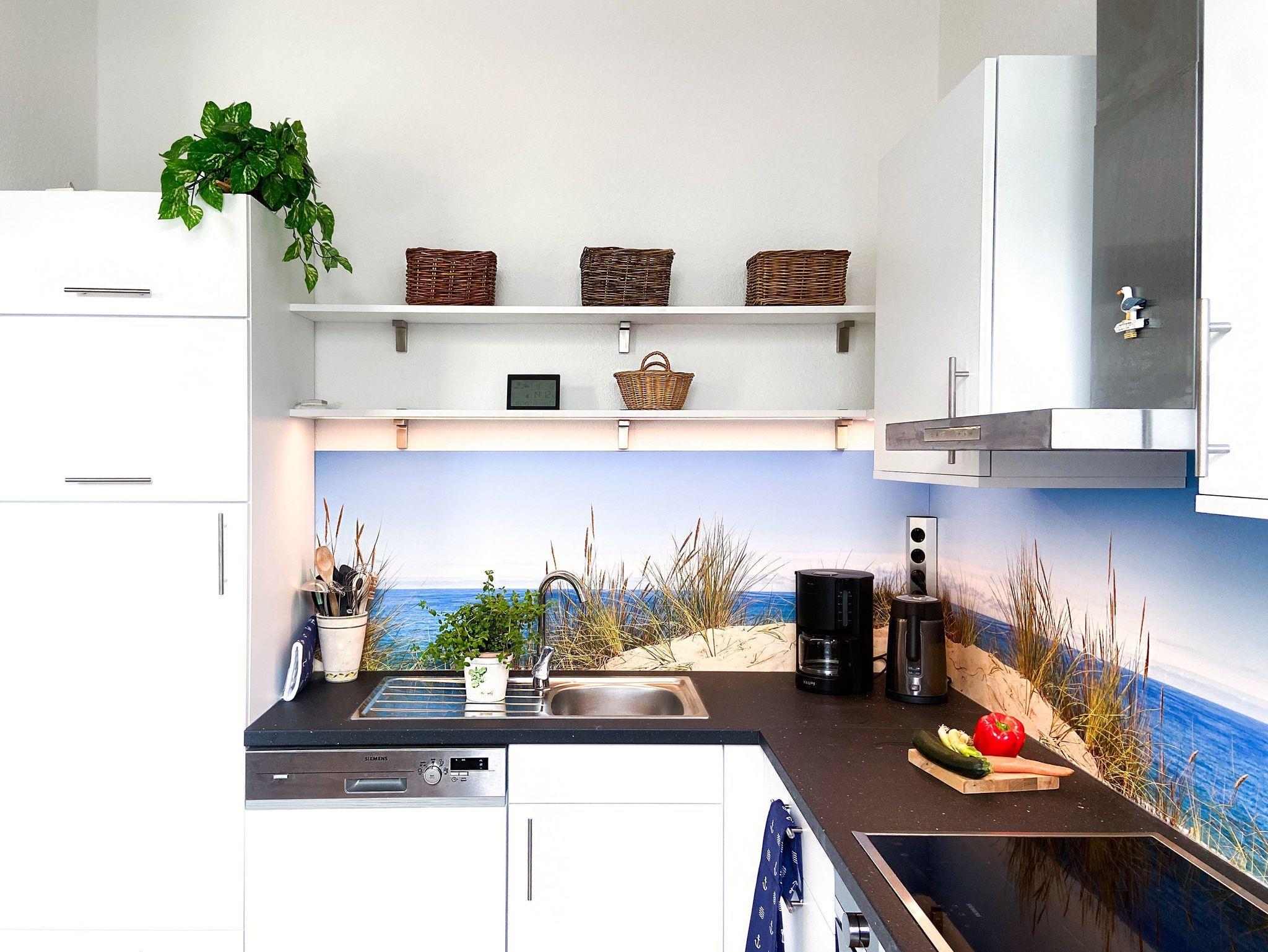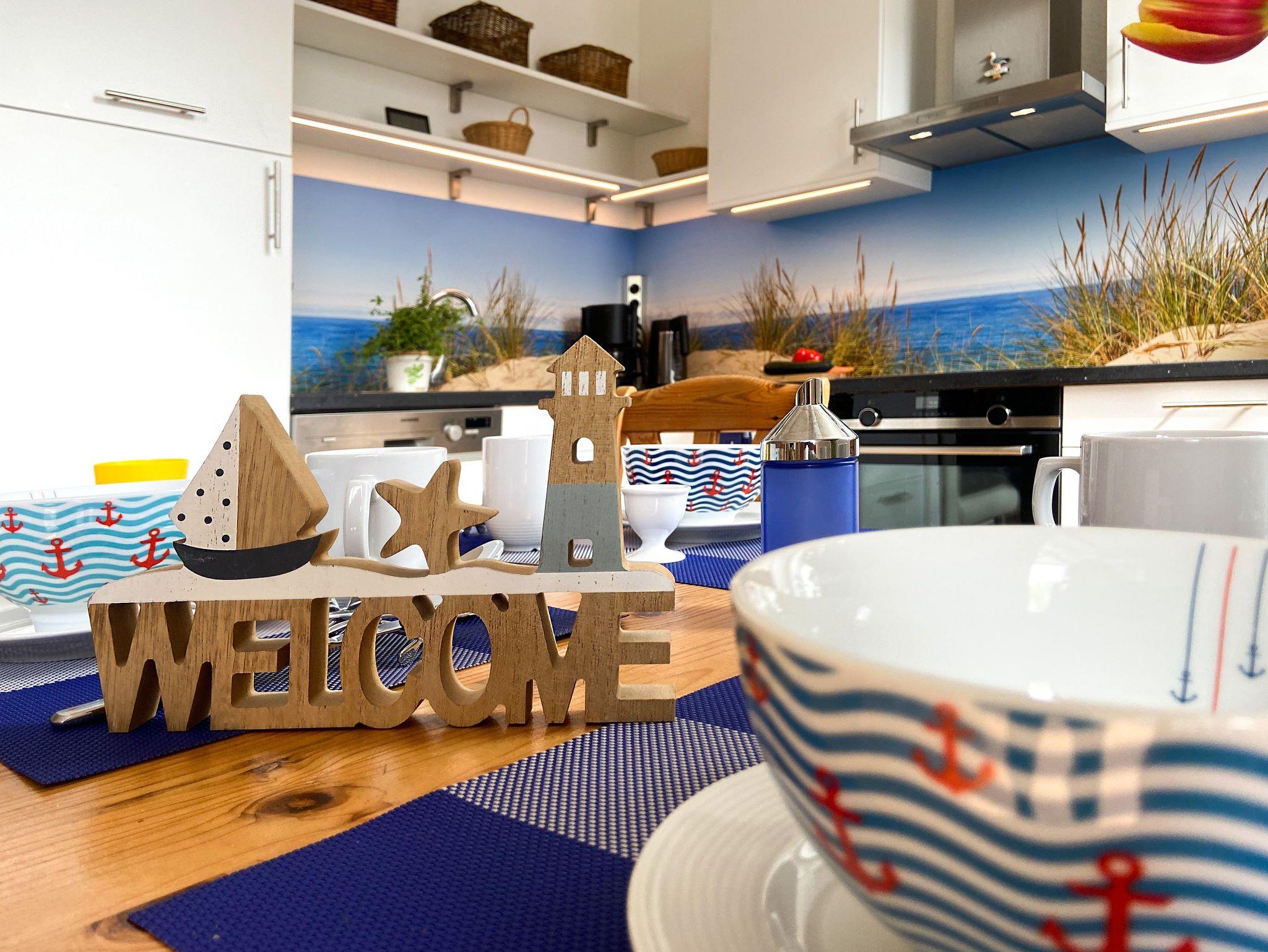 Die offene Küche verfügt über eine sehr gute Ausstattung für alle Selbstversorger (Geschirrspülmaschine, Cerankochfeld mit Backofen, Kühlschrank mit Gefrierfach, Mikrowelle, Kaffeemaschine, Wasserkocher, Toaster, Eierkocher sowie reichhaltigem Bestand an Geschirr, Gläsern und Besteck).