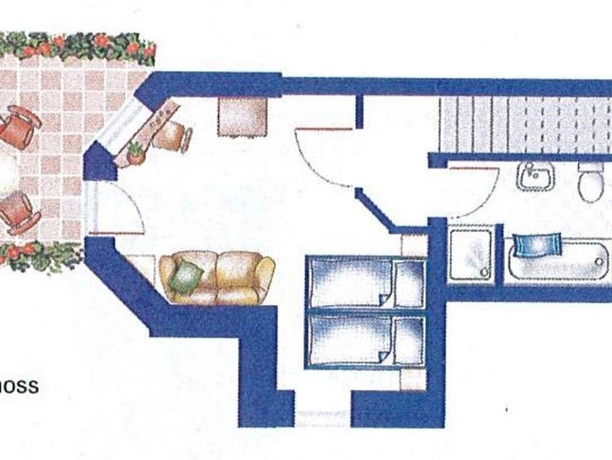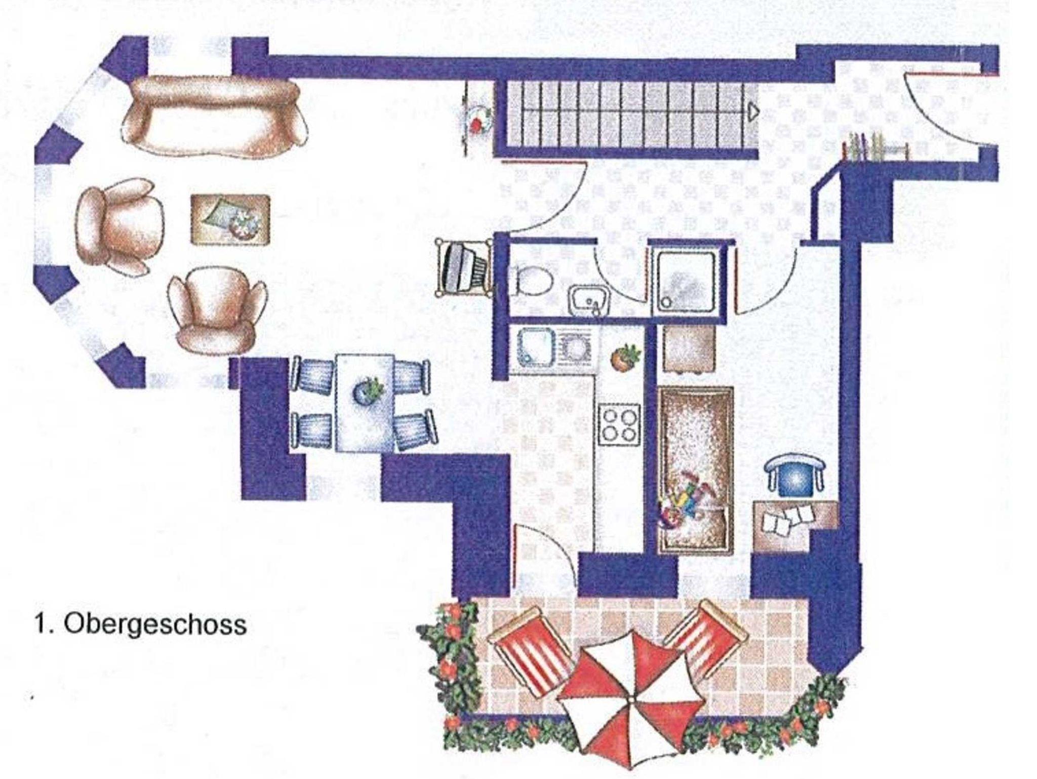 • Bad I: Dusche, Waschbecken, Toilette, Spiegel (im Obergeschoss)