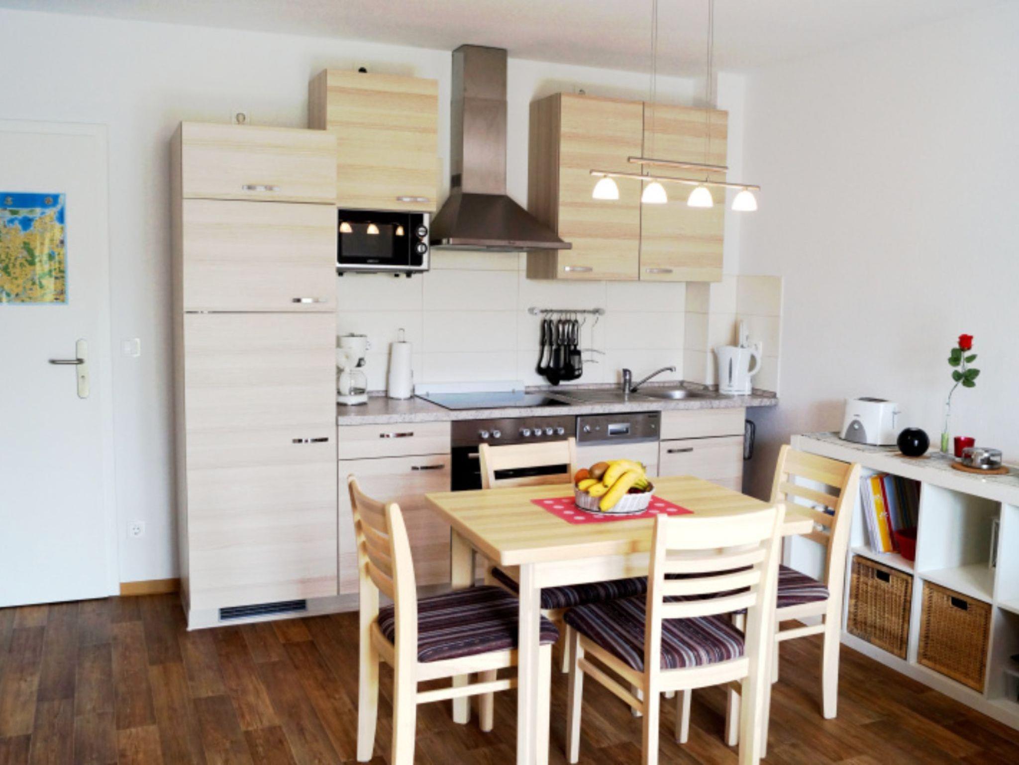 Im integrierten Küchenbereich befinden sich unter anderem ein Herd mit Ceranherd mit 4 Kochfeldern, ein Geschirrspüler, ein Kühlschrank mit großem, separaten Gefrierfach, eine Mikrowelle, eine Kaffeemaschine und ein Wasserkocher.