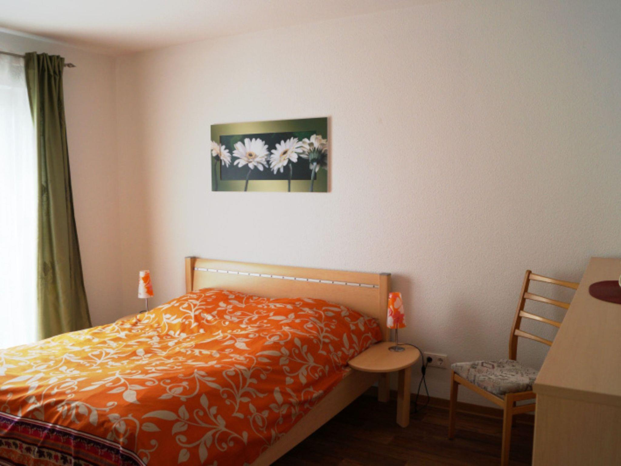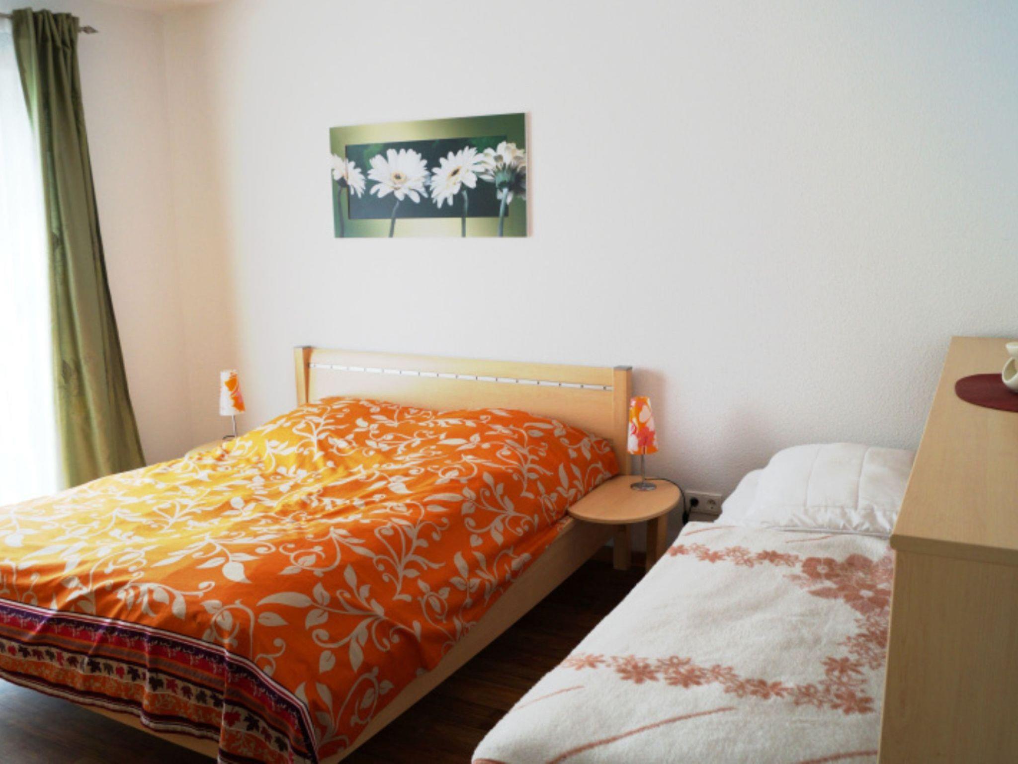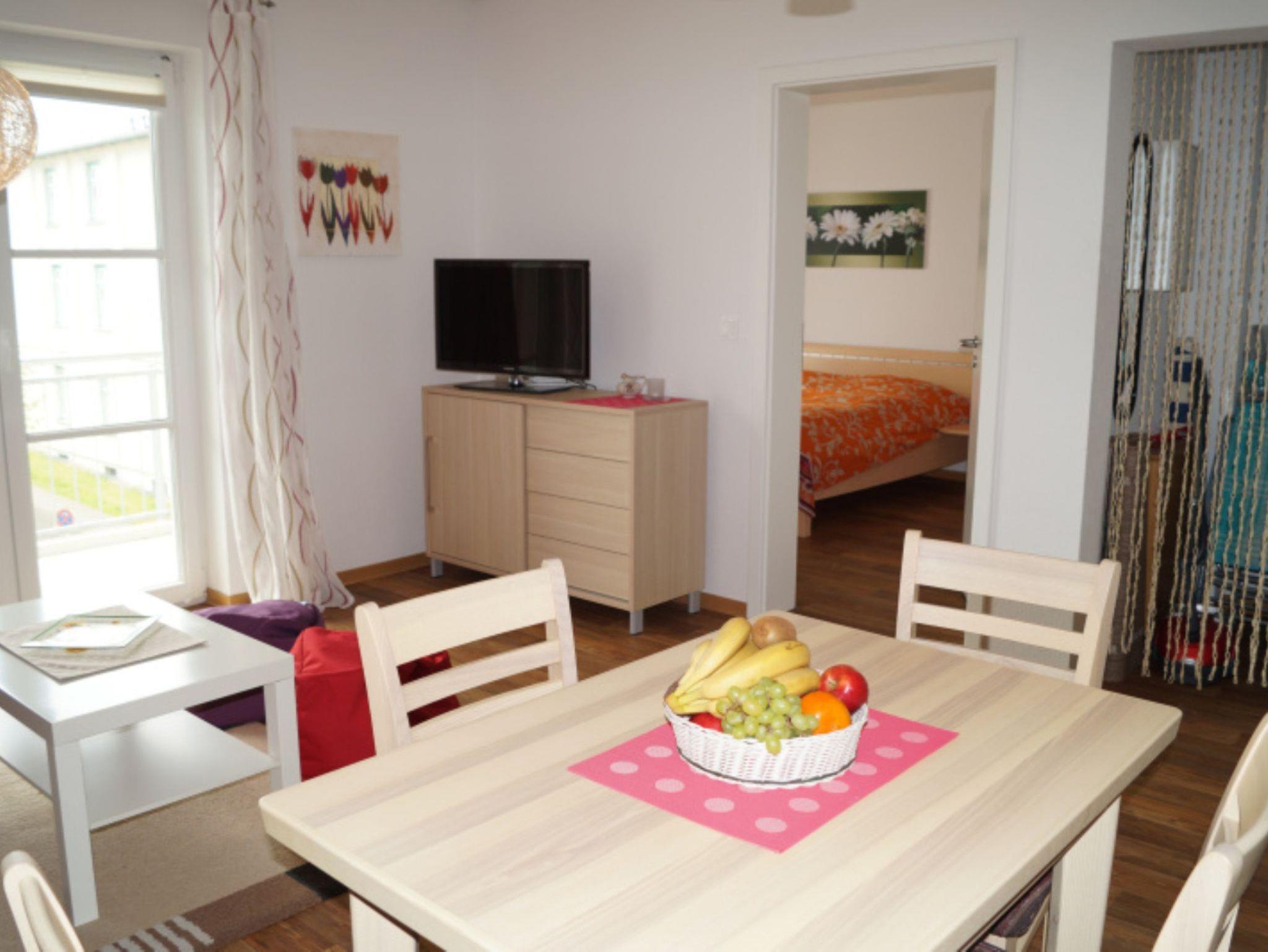 Ihre helle Ferienwohnung verfügt über ein Wohn- und ein Schlafzimmer. Im Wohnbereich befindet sich eine Schlafcouch sowie ein Fernseher.